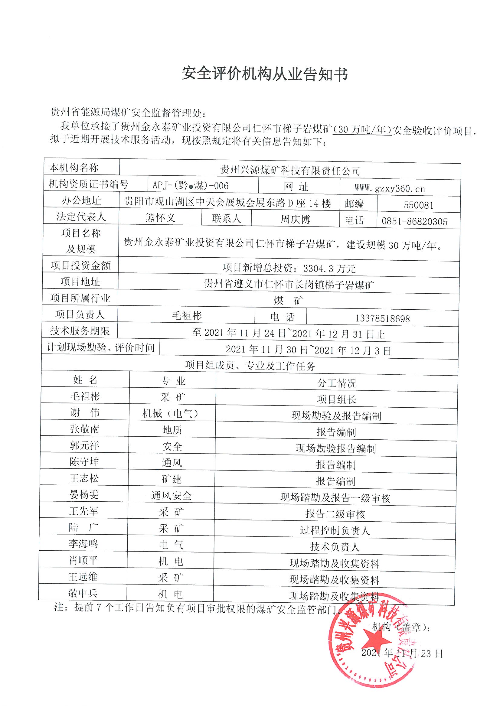 安全評價機構(gòu)從業(yè)告知書(貴州金永泰礦業(yè)投資有限公司仁懷市梯子巖煤礦(30萬噸/ 年)安全驗收評價)