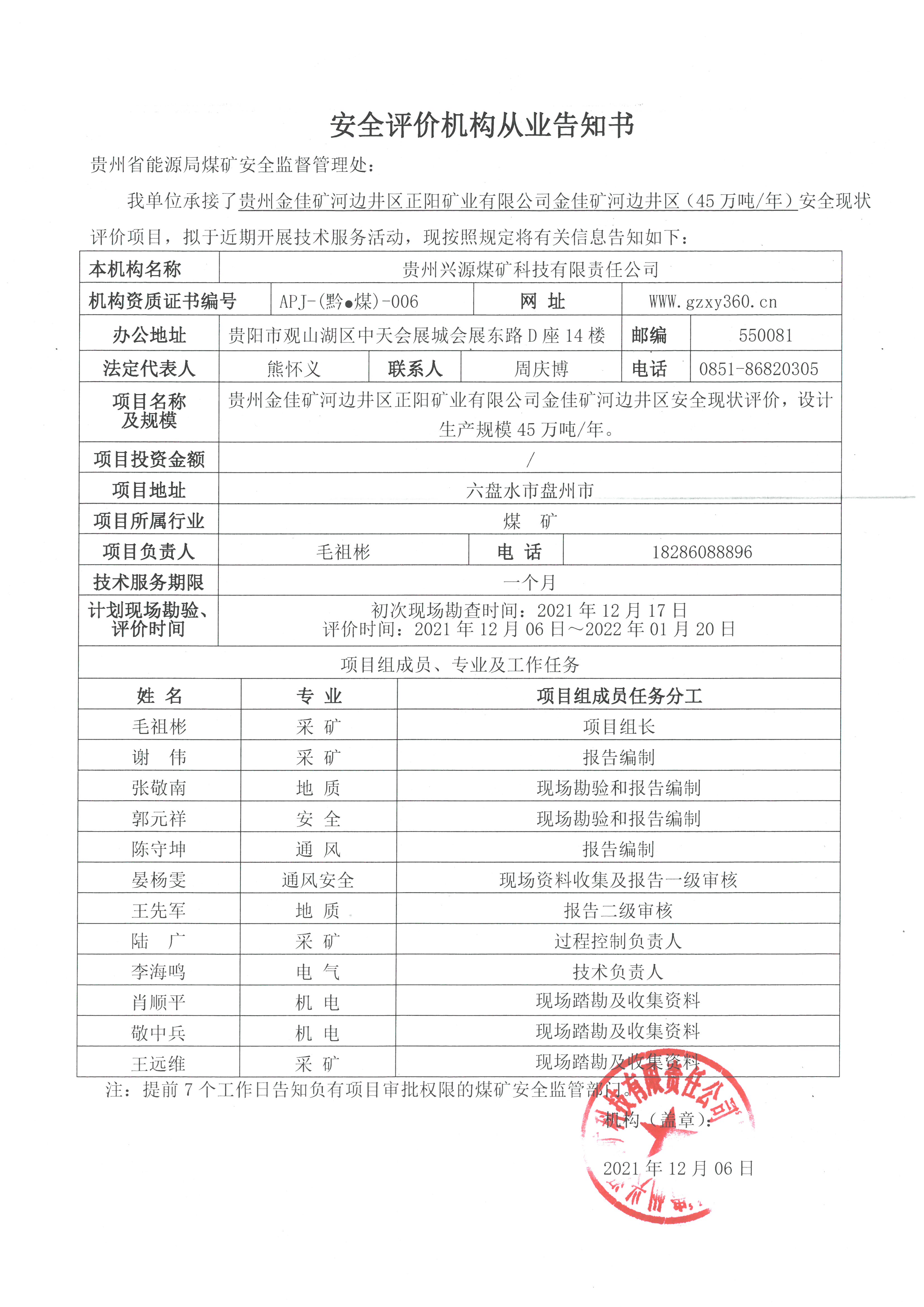 安全評價機構從業告知書(貴州金佳礦河邊井區正陽礦業有限公司金佳礦河邊井區(45萬噸/年)安全現狀評價)