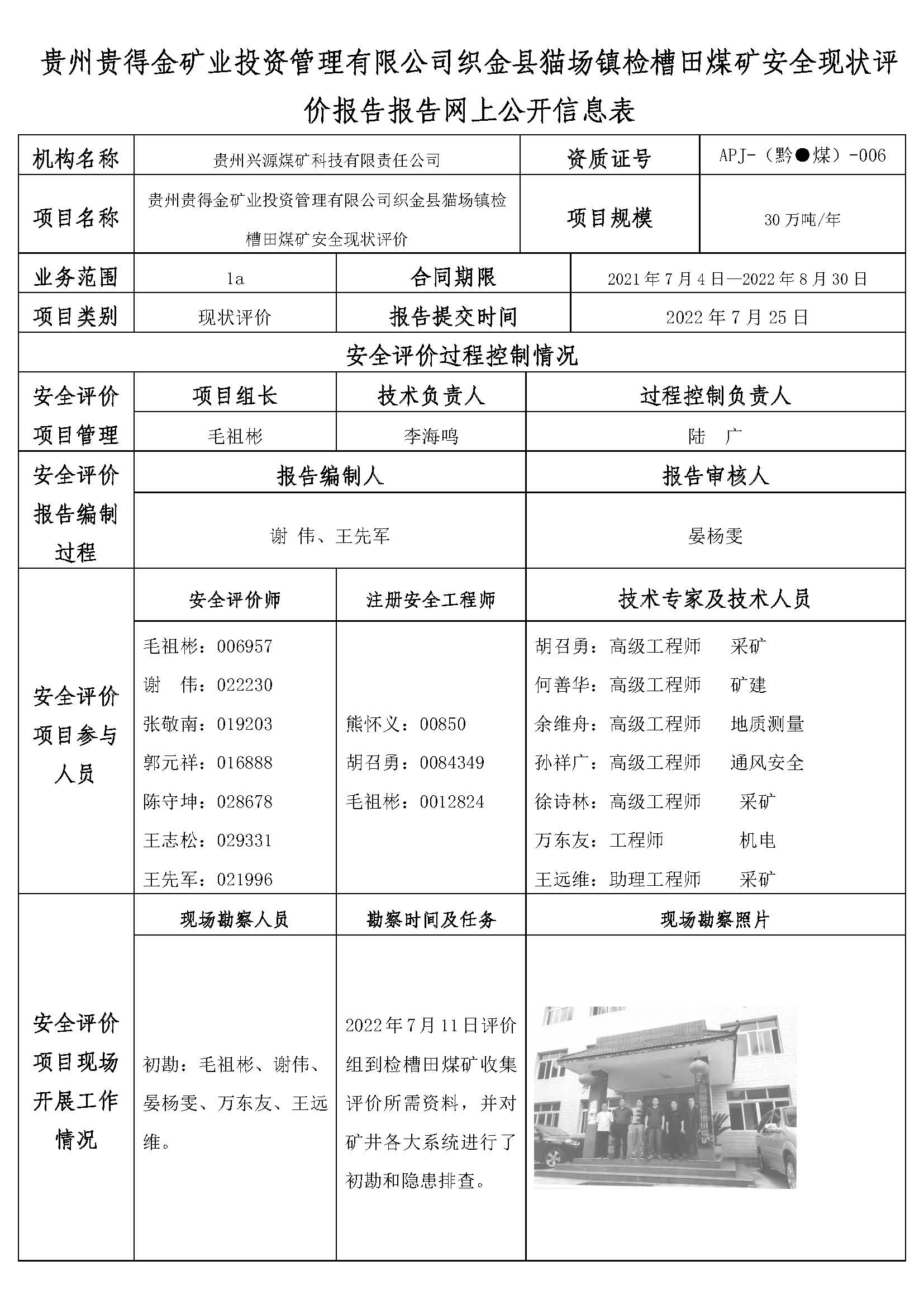 貴州貴得金礦業(yè)投資管理有限公司織金縣貓場鎮(zhèn)檢槽田煤礦安全現(xiàn)狀評價報告報告網(wǎng)上公開信息表
