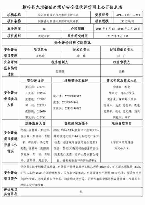 桐梓縣九壩鎮仙巖煤礦安全現狀評價網上公開信息表