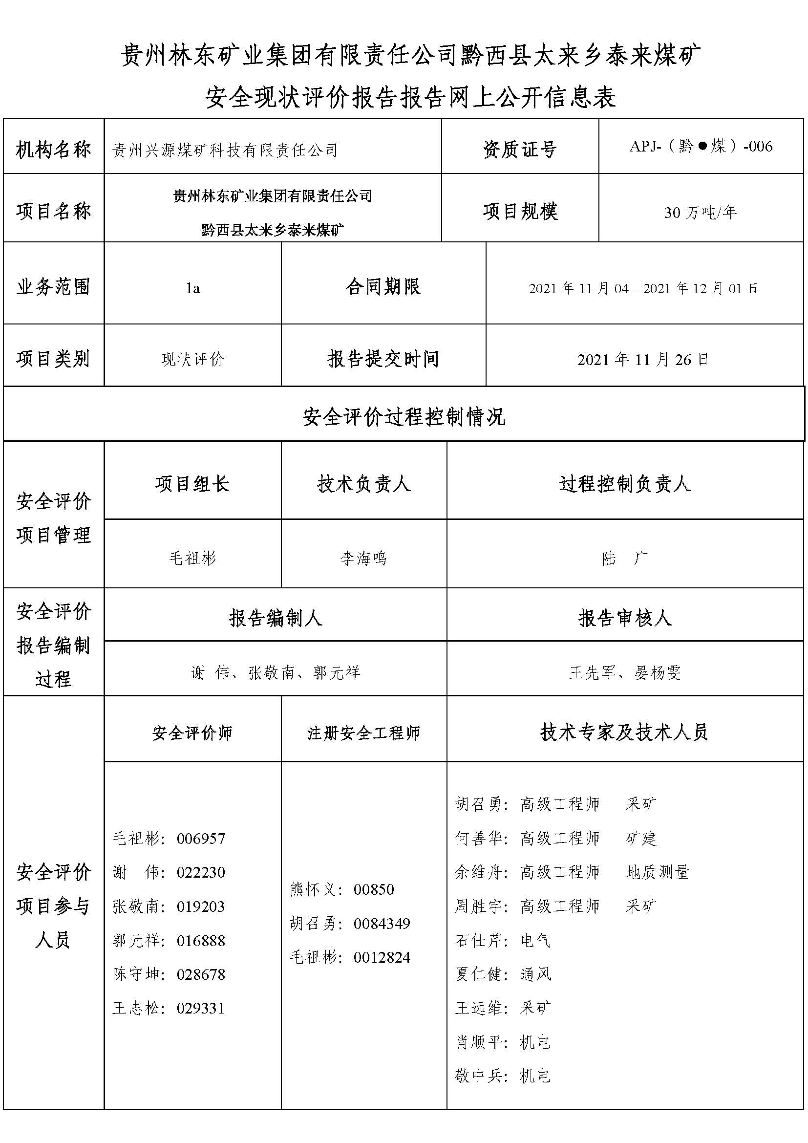 貴州林東礦業集團有限責任公司黔西縣太來鄉泰來煤礦 安全現狀評價報告報告網上公開信息表