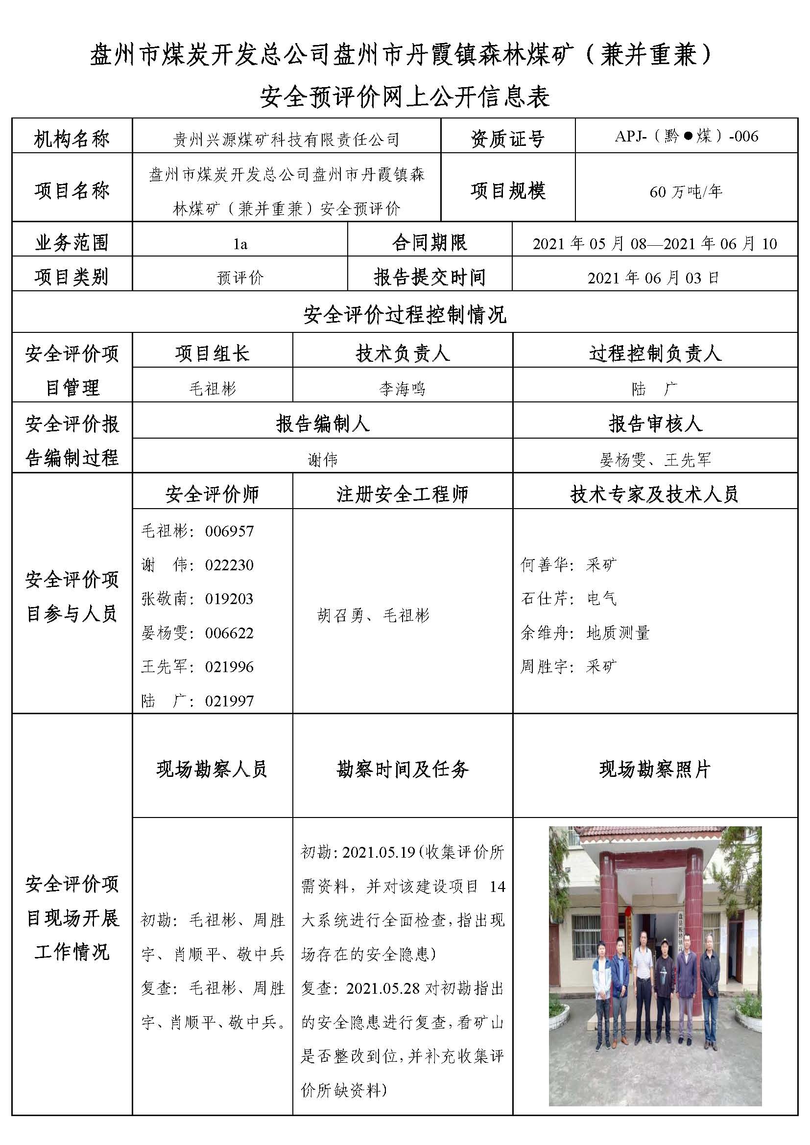 盤州市煤炭開發總公司盤州市丹霞鎮森林煤礦(兼并重兼)安全預評價網上公開信息表