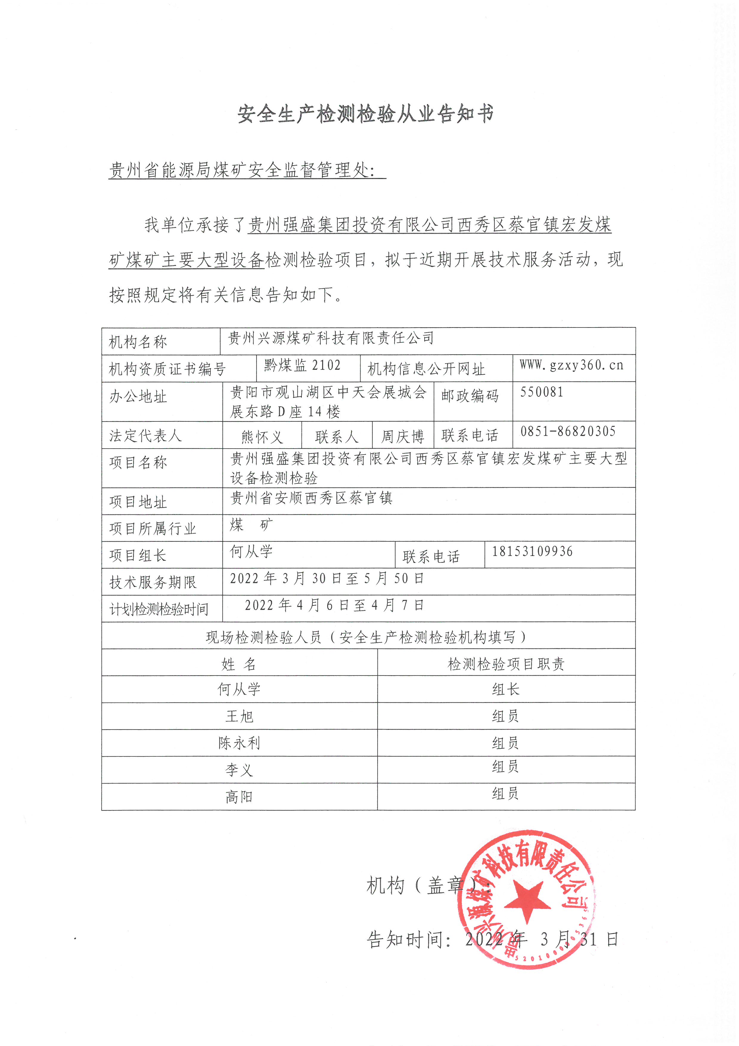 安全生產(chǎn)檢測(cè)檢驗(yàn)從業(yè)告知書(shū)【貴州強(qiáng)盛集團(tuán)投資有限公司西秀區(qū)蔡官鎮(zhèn)宏發(fā)煤礦】