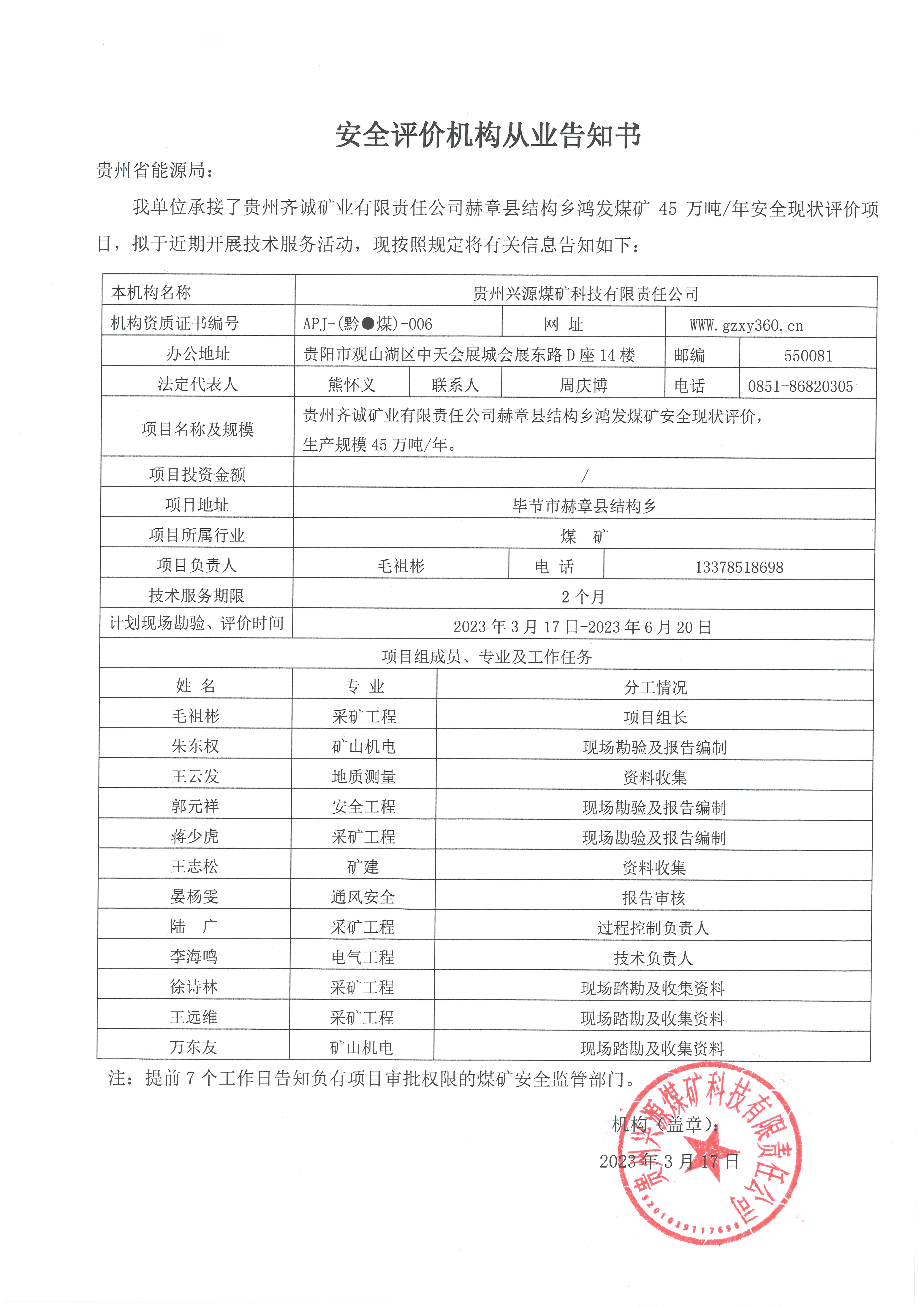 安全評(píng)價(jià)機(jī)構(gòu)從業(yè)告知書(shū)【貴州齊誠(chéng)礦業(yè)有限責(zé)任公司赫章縣結(jié)構(gòu)鄉(xiāng)鴻發(fā)煤礦】