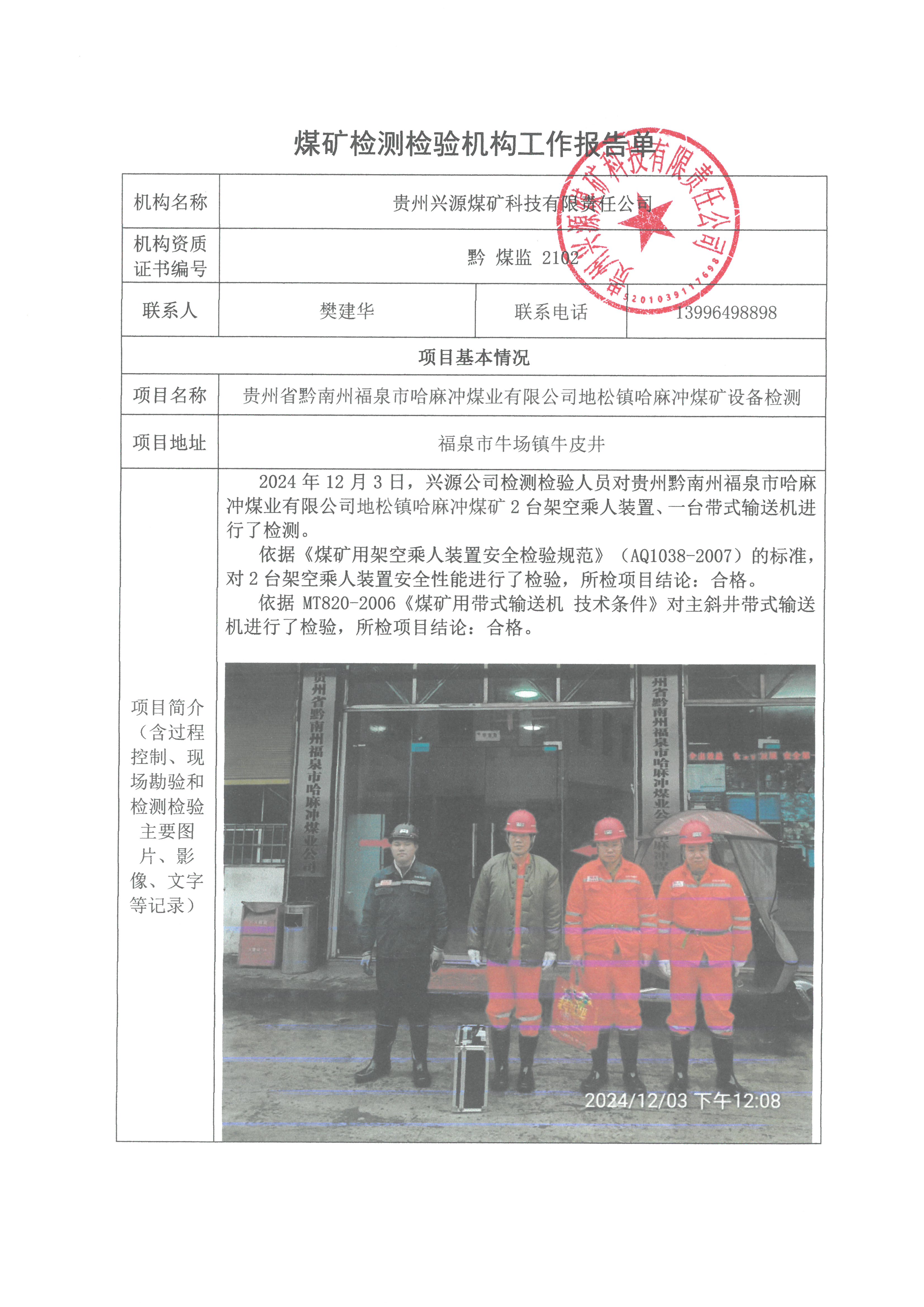 煤礦檢測(cè)檢驗(yàn)機(jī)構(gòu)工作報(bào)告單【貴州省黔南州福泉市哈麻沖煤業(yè)有限公司地松鎮(zhèn)哈麻沖煤礦設(shè)備檢測(cè)】