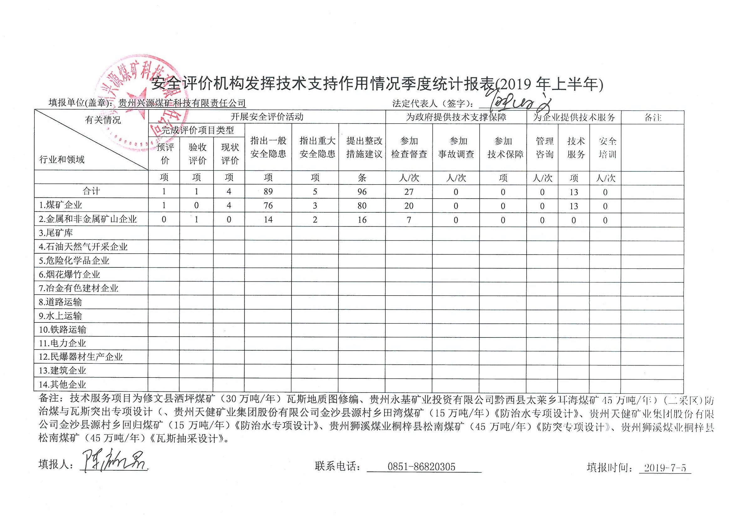 安全評價機構發揮技術支持作用情況季度統計報表(2019年上半年)