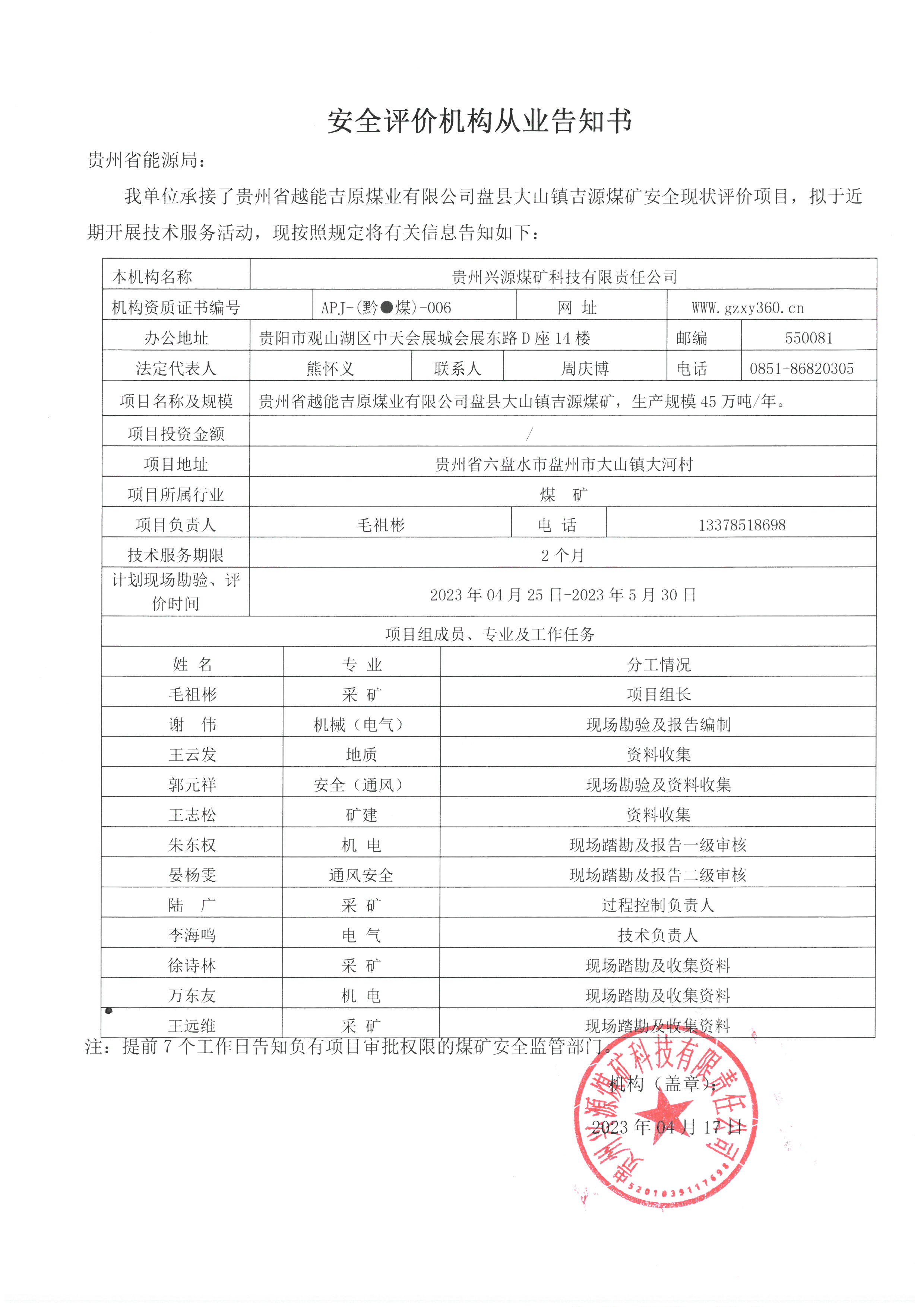 安全評價機構從業告知書[貴州省越能吉原煤業有限公司盤縣大山鎮吉源煤礦]