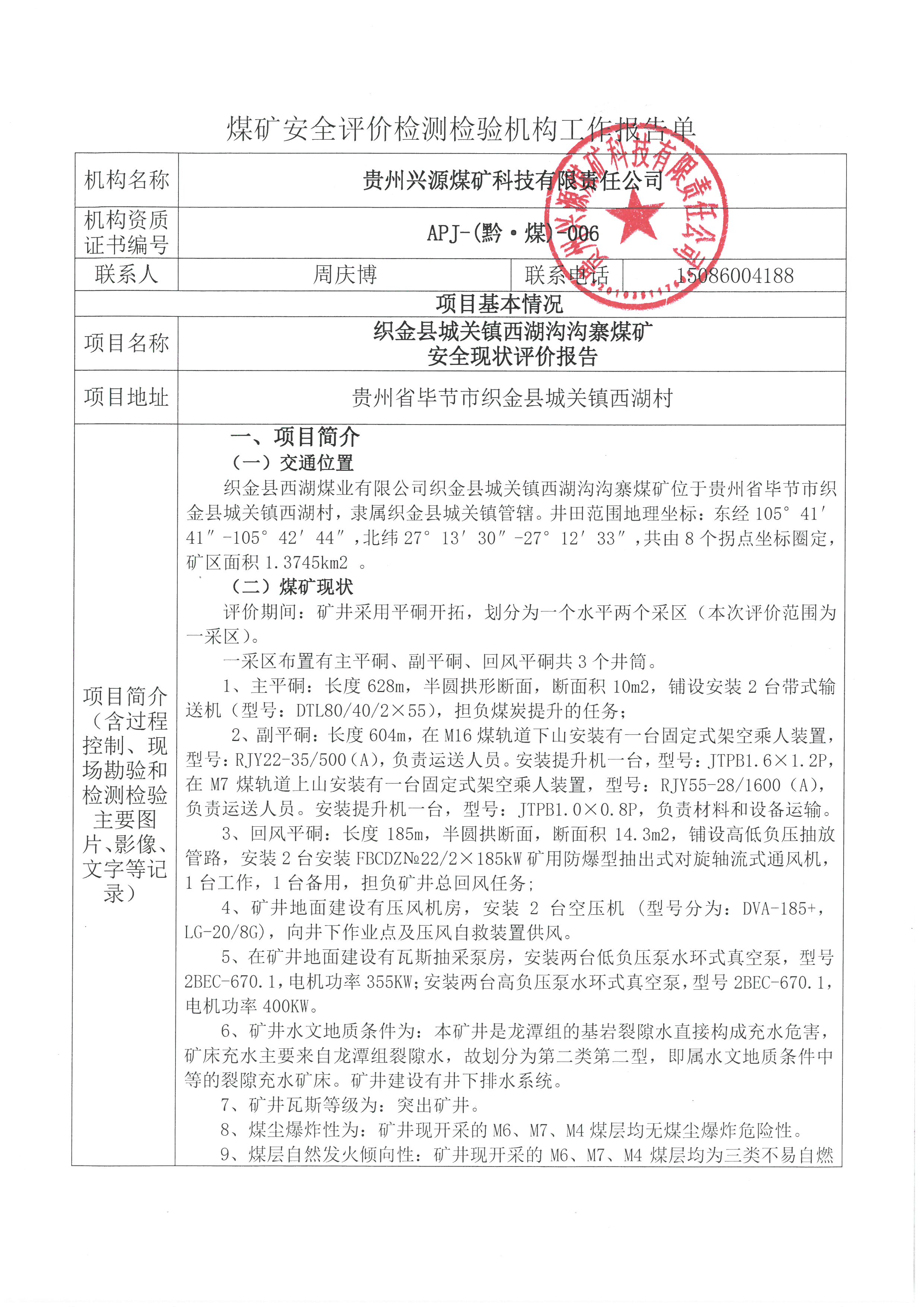煤礦安全評價檢測檢驗機構工作報告單【織金縣西湖煤業有限公司織金縣西湖溝溝寨煤礦安全現狀評價報告】