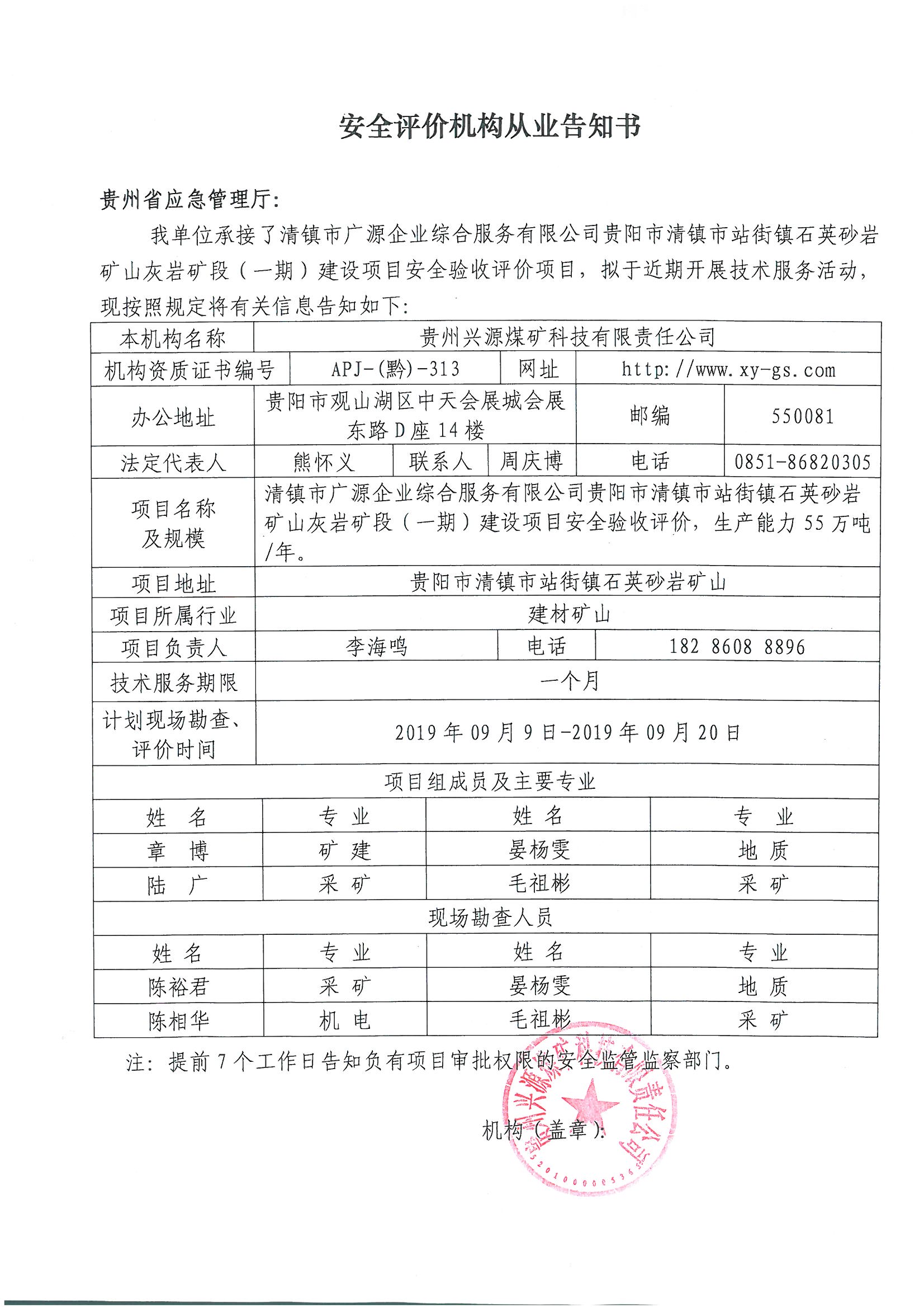 安全評價機(jī)構(gòu)從業(yè)告知書【清鎮(zhèn)市廣源企業(yè)綜合服務(wù)有限公司貴陽市清鎮(zhèn)市站街鎮(zhèn)石英砂巖礦山灰?guī)r礦段(一)期建設(shè)項目】