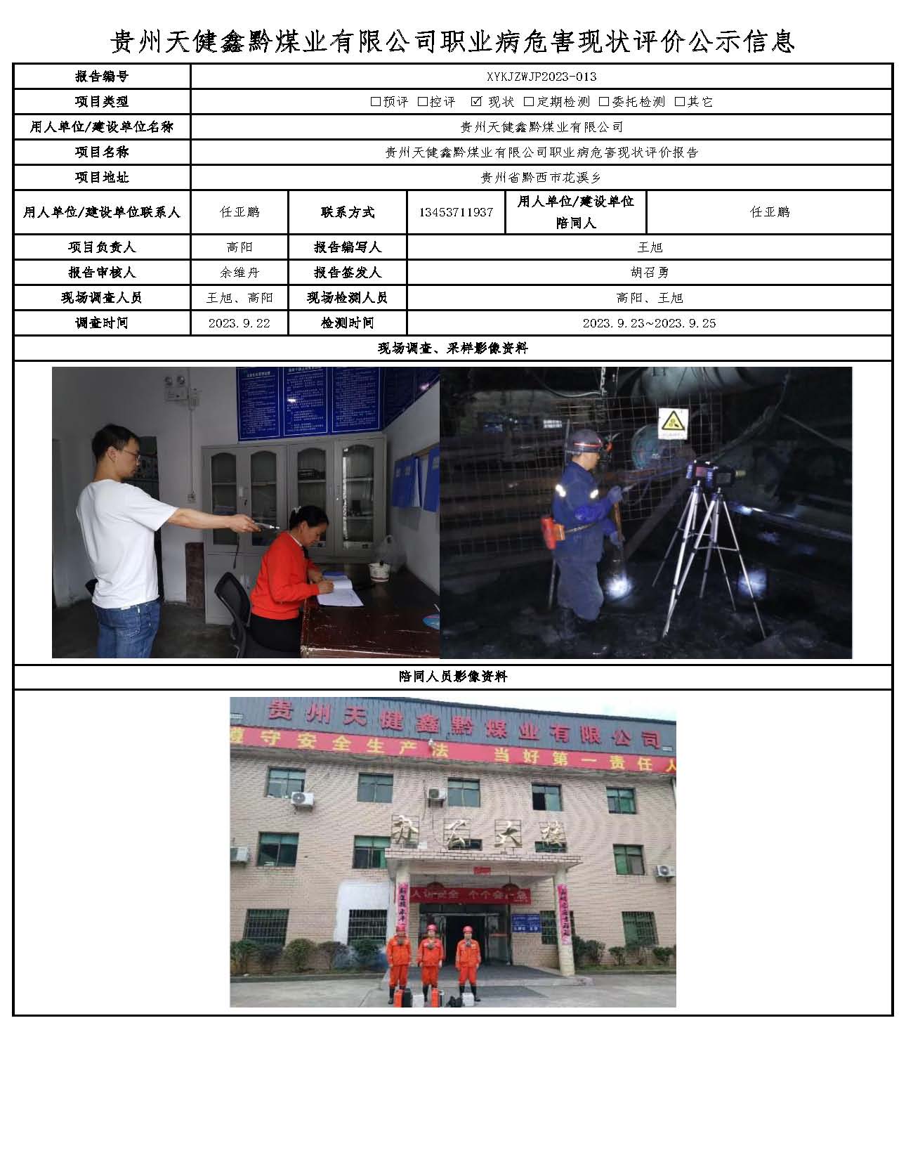 貴州天健鑫黔煤業有限公司職業病危害現狀評價公示信息