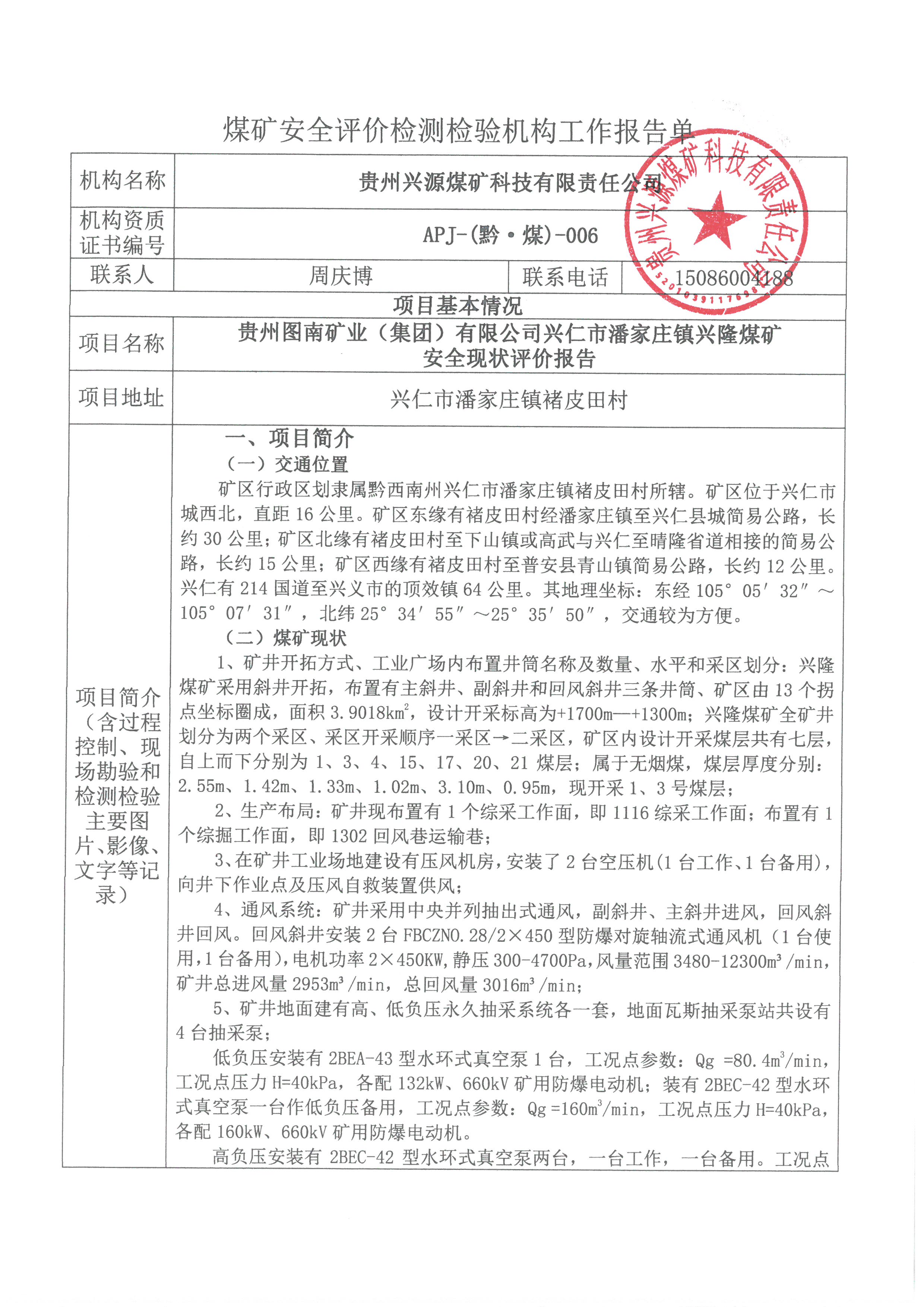 煤礦安全評價檢測檢驗機構工作報告單【貴州圖南礦業(集團)有限公司興仁市潘家莊鎮興隆煤礦安全現狀評價報告】
