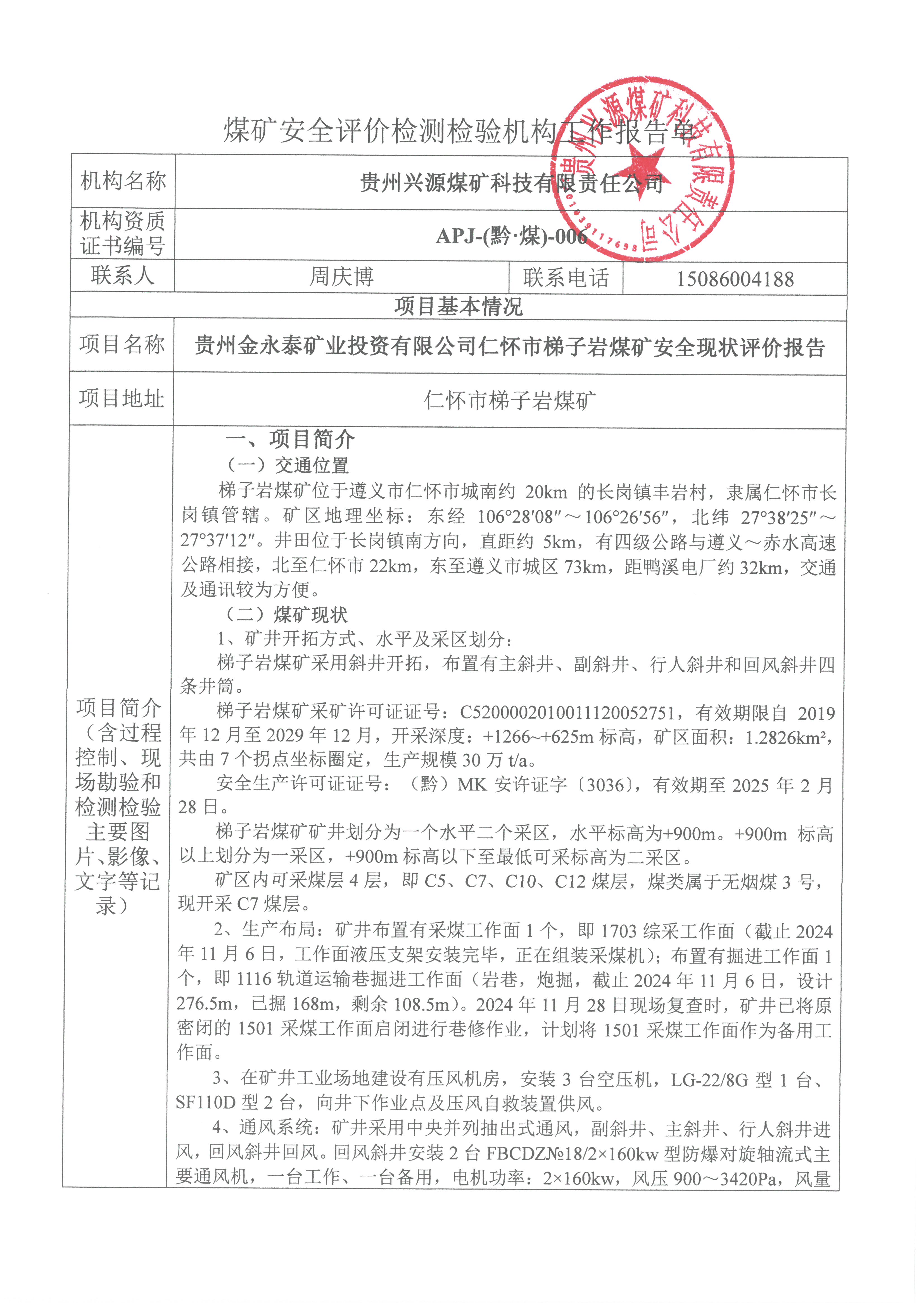煤礦安全評價檢測檢驗機構工作報告單【貴州金永泰礦業投資有限公司仁懷市梯子巖煤礦安全現狀評價報告】