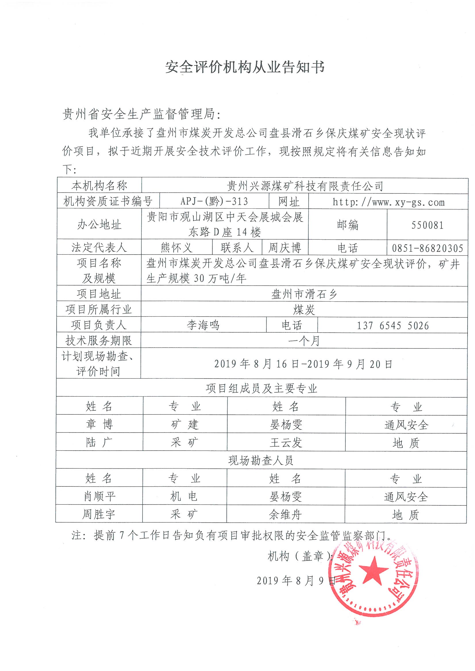 安全評價機(jī)構(gòu)從業(yè)告知書[盤州市煤炭開發(fā)總公司盤縣滑石鄉(xiāng)保慶煤礦]