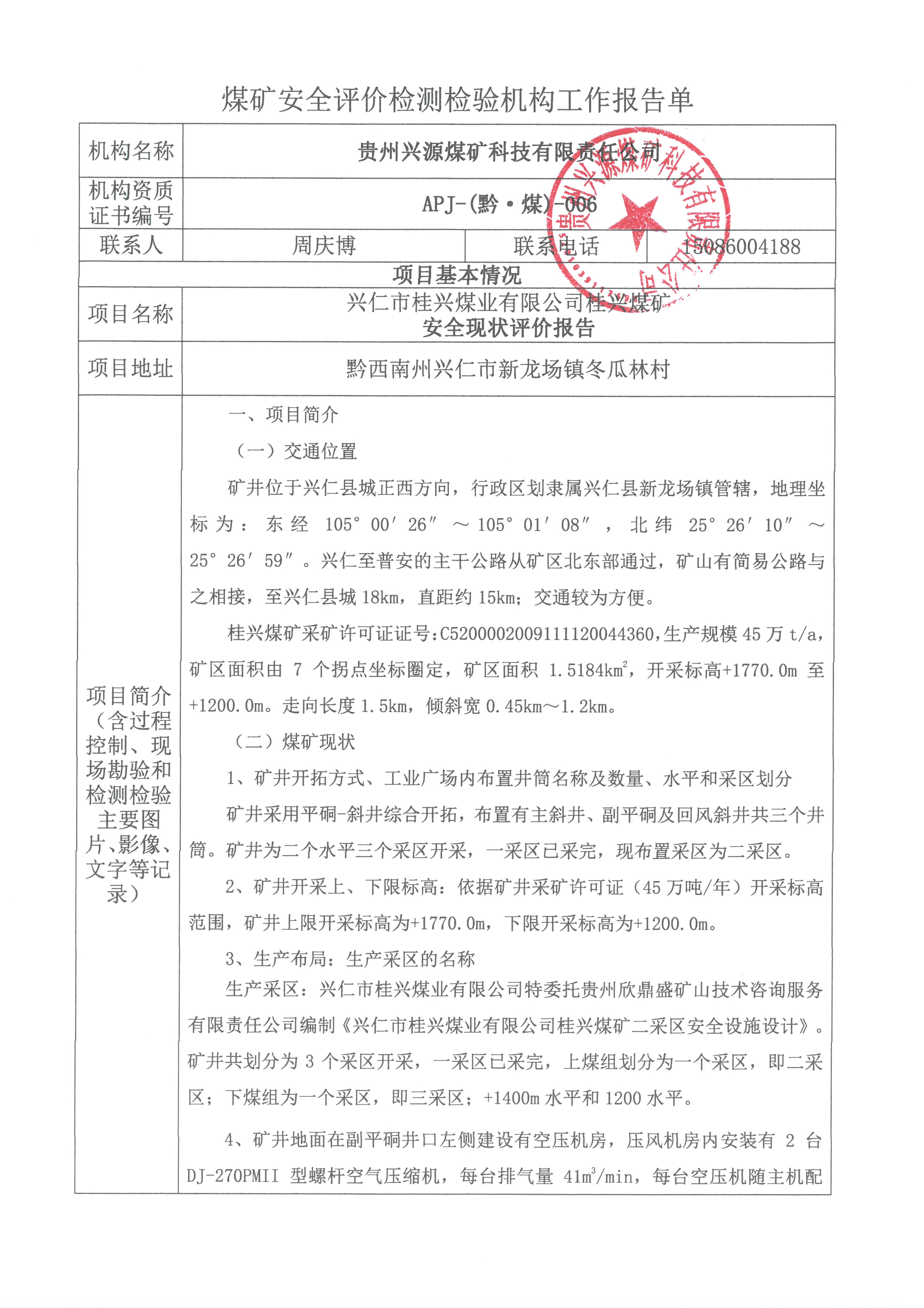 煤礦安全評價檢測檢驗機(jī)構(gòu)工作報告單【興仁市桂興煤業(yè)有限公司桂興煤礦安全現(xiàn)狀評價報告】
