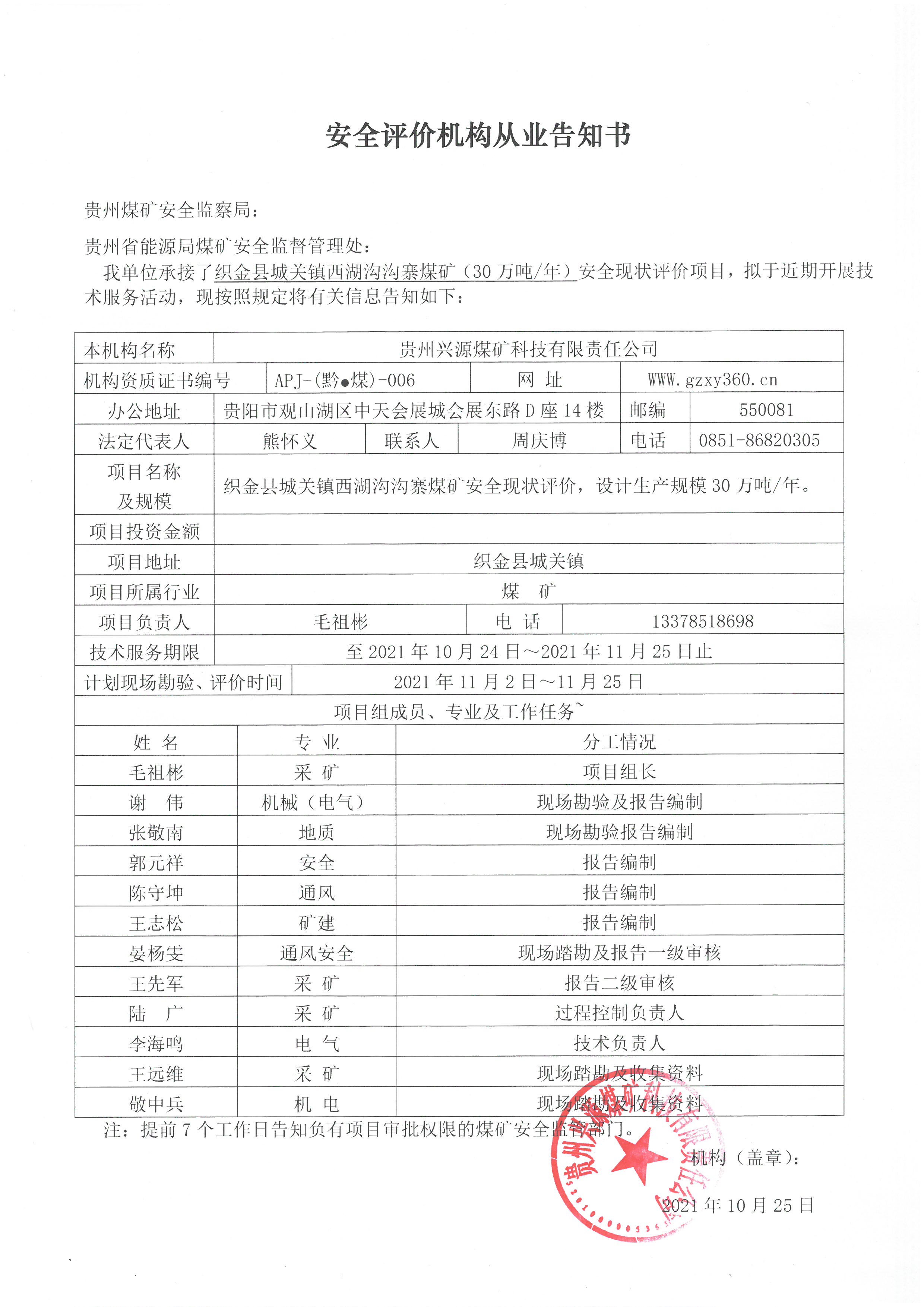 安全評(píng)價(jià)機(jī)構(gòu)從業(yè)告知書(織金縣城關(guān)鎮(zhèn)西湖溝溝寨煤礦(30萬噸/年)安全現(xiàn)狀評(píng)價(jià))