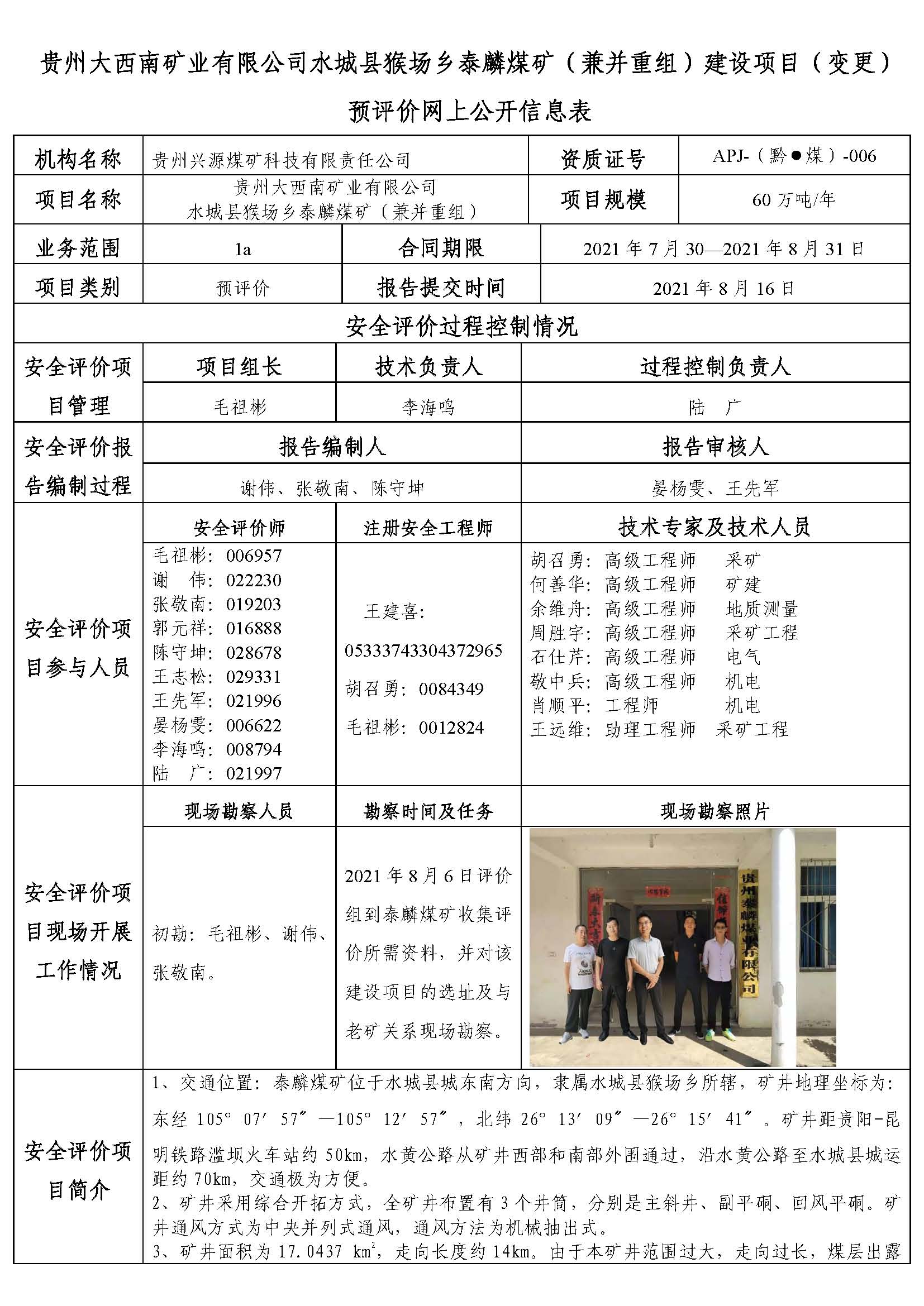 貴州大西南礦業有限公司水城縣猴場鄉泰麟煤礦(兼并重組)建設項目(變更)預評價網上公開信息表