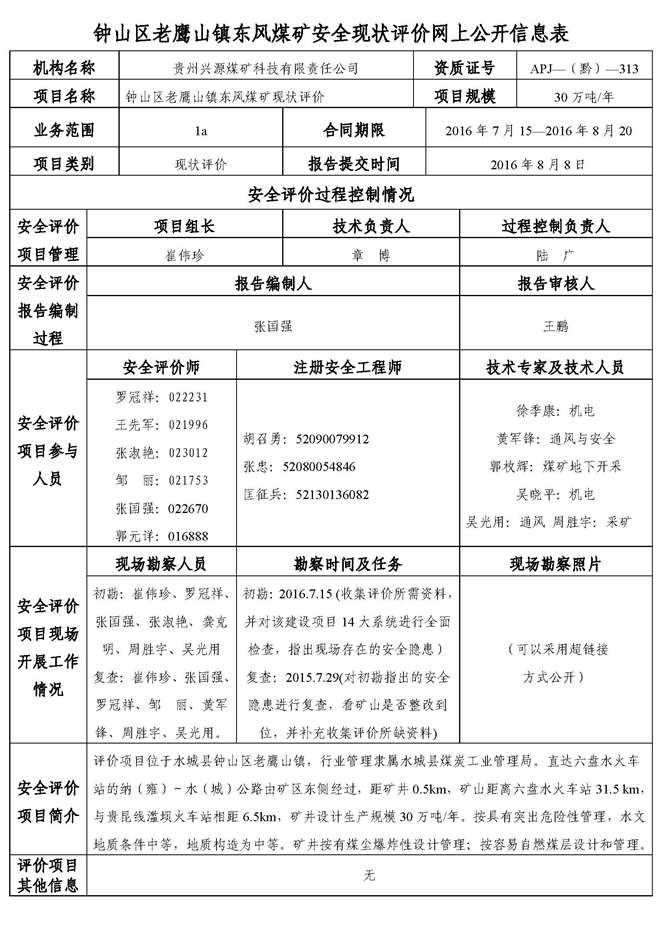 鐘山區老鷹山鎮東風煤礦安全現狀評價網上公開信息表