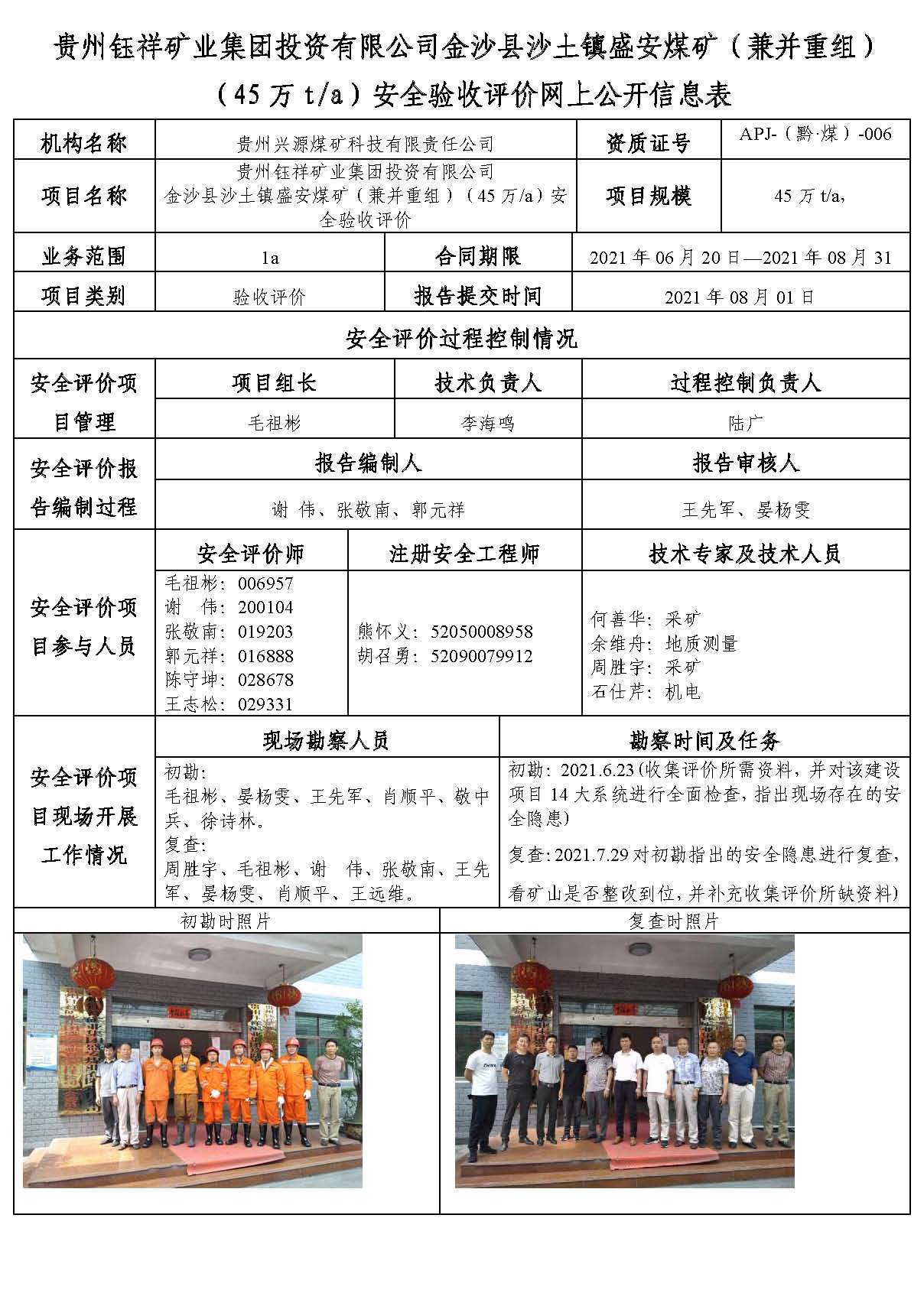 貴州鈺祥礦業(yè)集團(tuán)投資有限公司金沙縣沙土鎮(zhèn)盛安煤礦(兼并重組)(45萬t/a)安全驗(yàn)收評價(jià)網(wǎng)上公開信息表