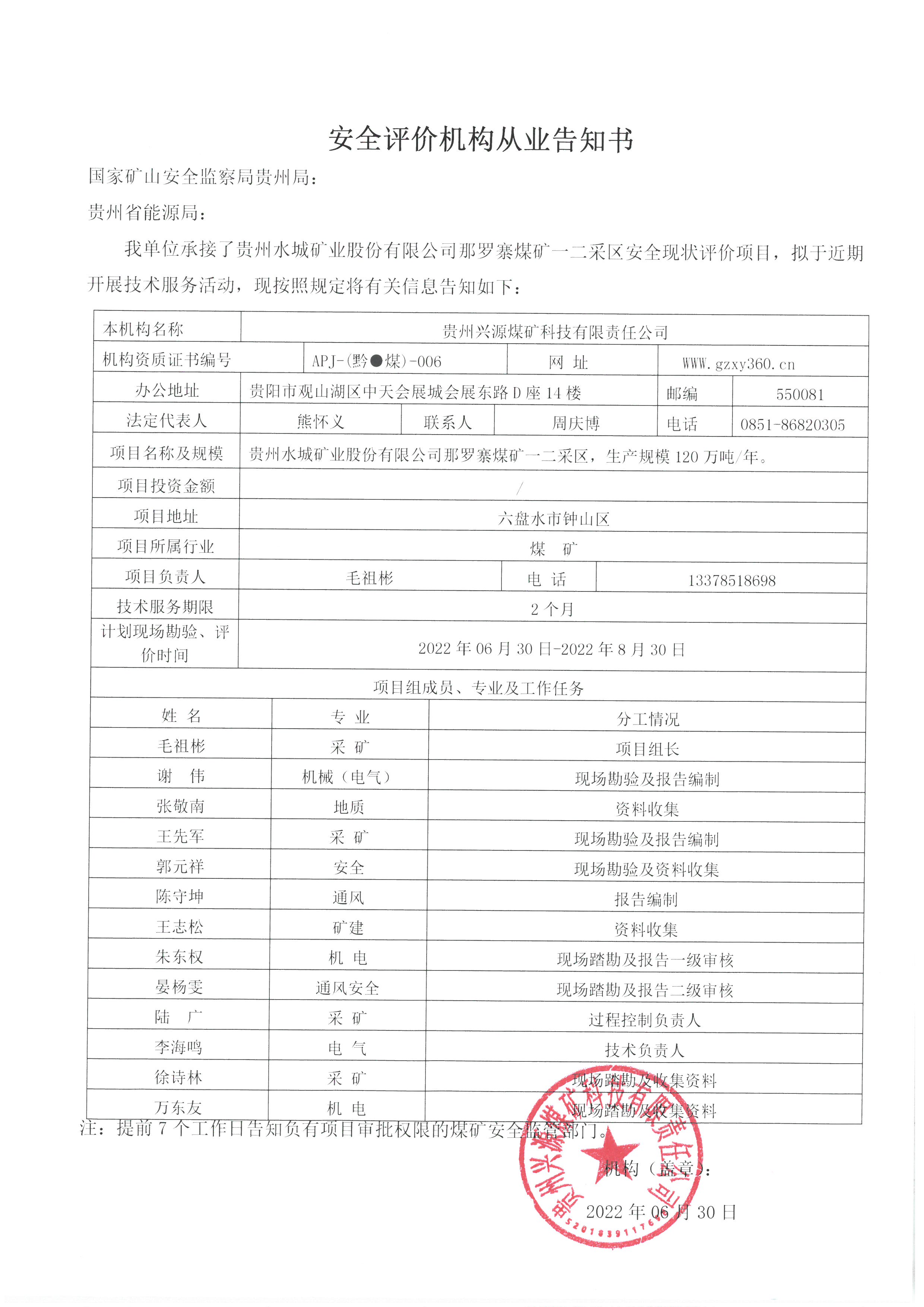 安全評價(jià)機(jī)構(gòu)從業(yè)告知書【貴州水城礦業(yè)股份有限公司那羅寨煤礦】