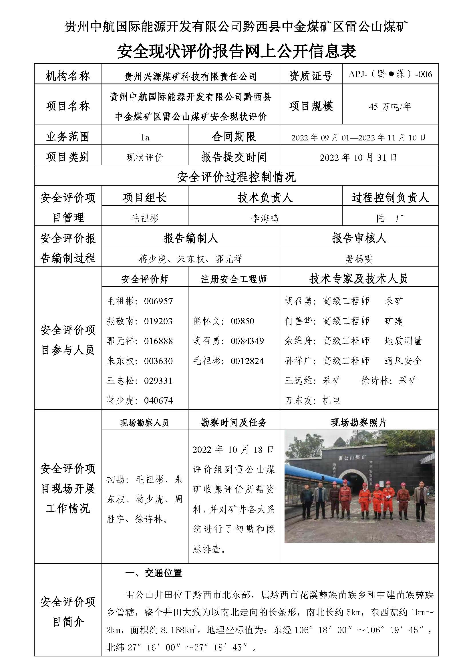貴州中航國際能源開發(fā)有限公司黔西縣中金煤礦區(qū)雷公山煤礦安全現(xiàn)狀評價(jià)報(bào)告網(wǎng)上公開信息表