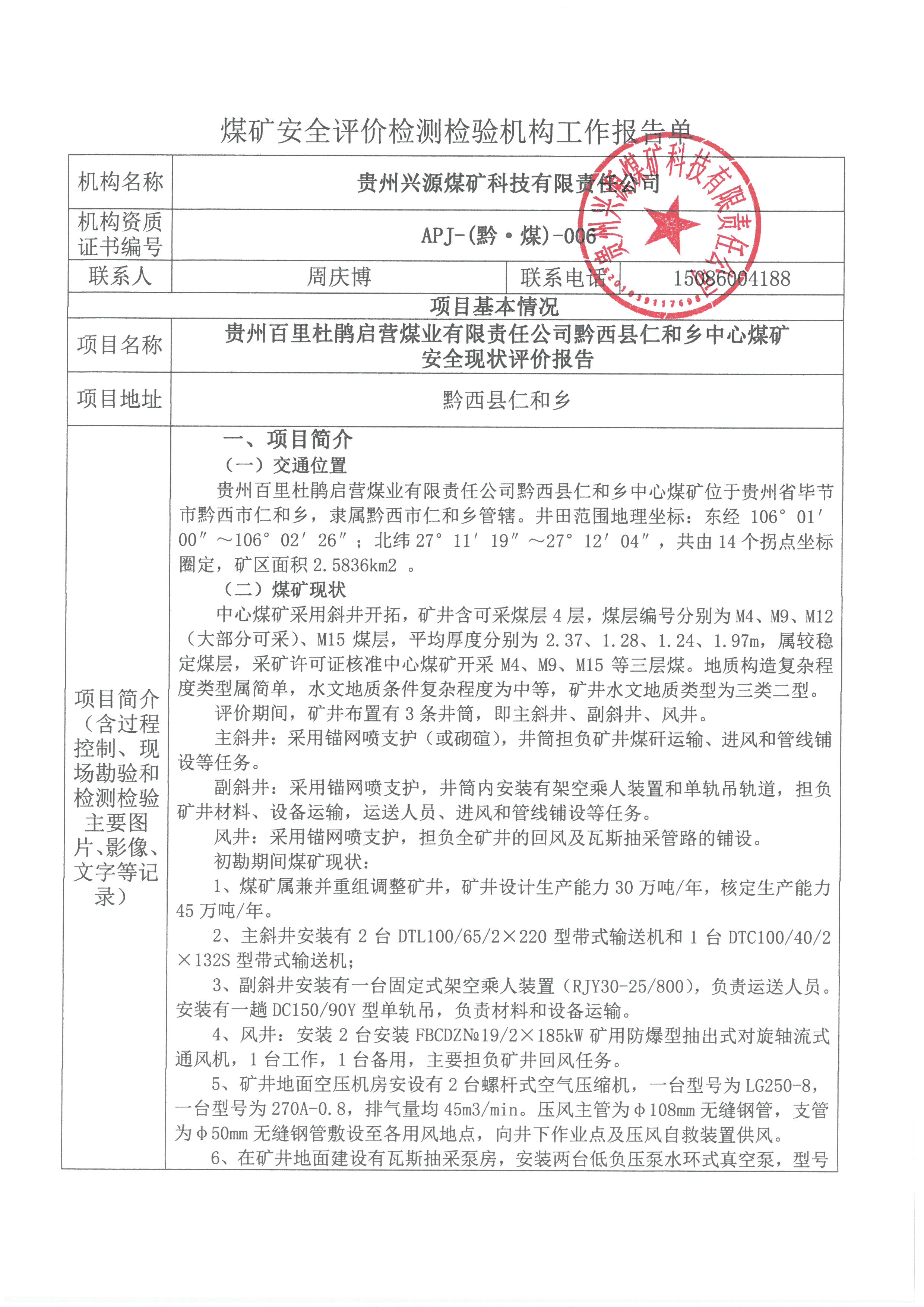 煤礦安全評價(jià)檢測檢驗(yàn)機(jī)構(gòu)工作報(bào)告單【貴州百里杜鵑啟營煤業(yè)有限責(zé)任公司黔西縣仁和鄉(xiāng)中心煤礦安全現(xiàn)狀評價(jià)報(bào)告】