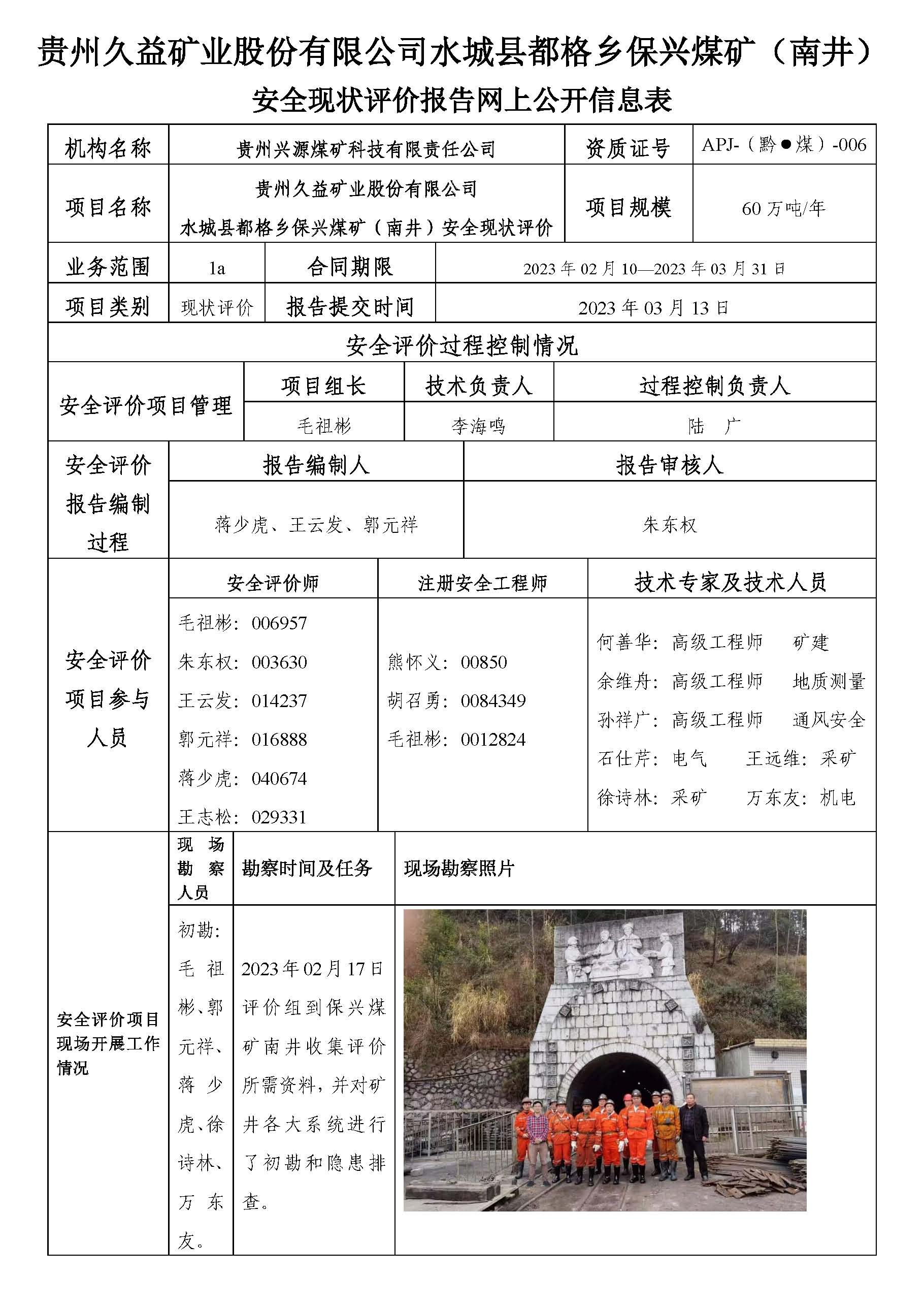 貴州久益礦業(yè)股份有限公司水城縣都格鄉(xiāng)保興煤礦(南井)安全現(xiàn)狀評價報告網(wǎng)上公開信息表