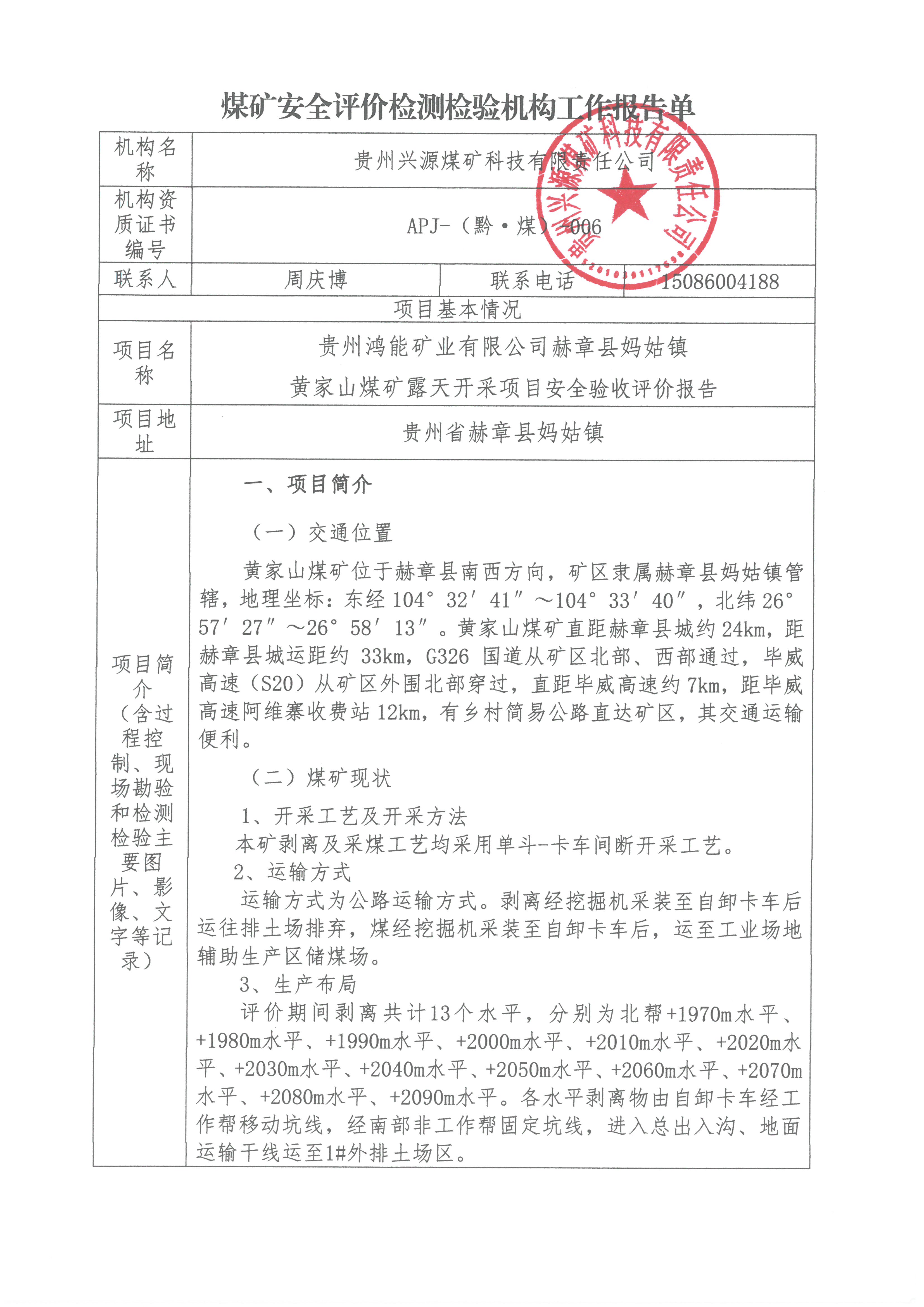 煤礦安全評價檢測檢驗機構工作報告單【貴州鴻能礦業(yè)有限公司赫章縣媽姑鎮(zhèn)黃家山煤礦露天開采項目安全驗收評價報告】
