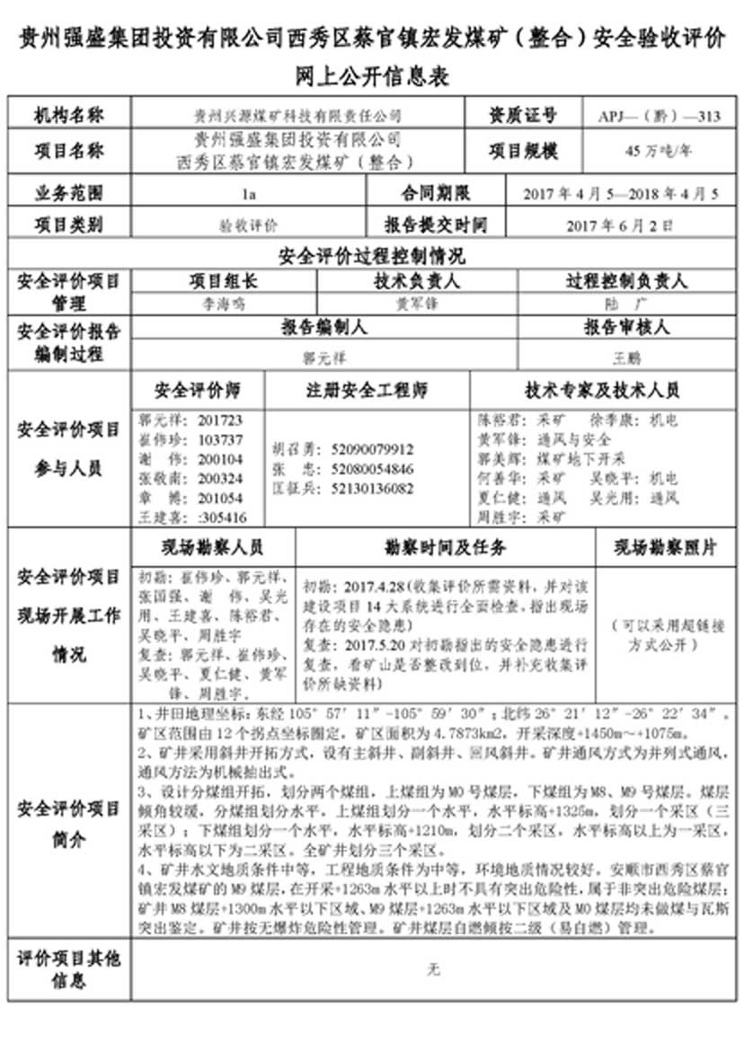 貴州強盛集團投資有限公司西秀區蔡官鎮宏發煤礦(整合)安全驗收評價網上公開信息表