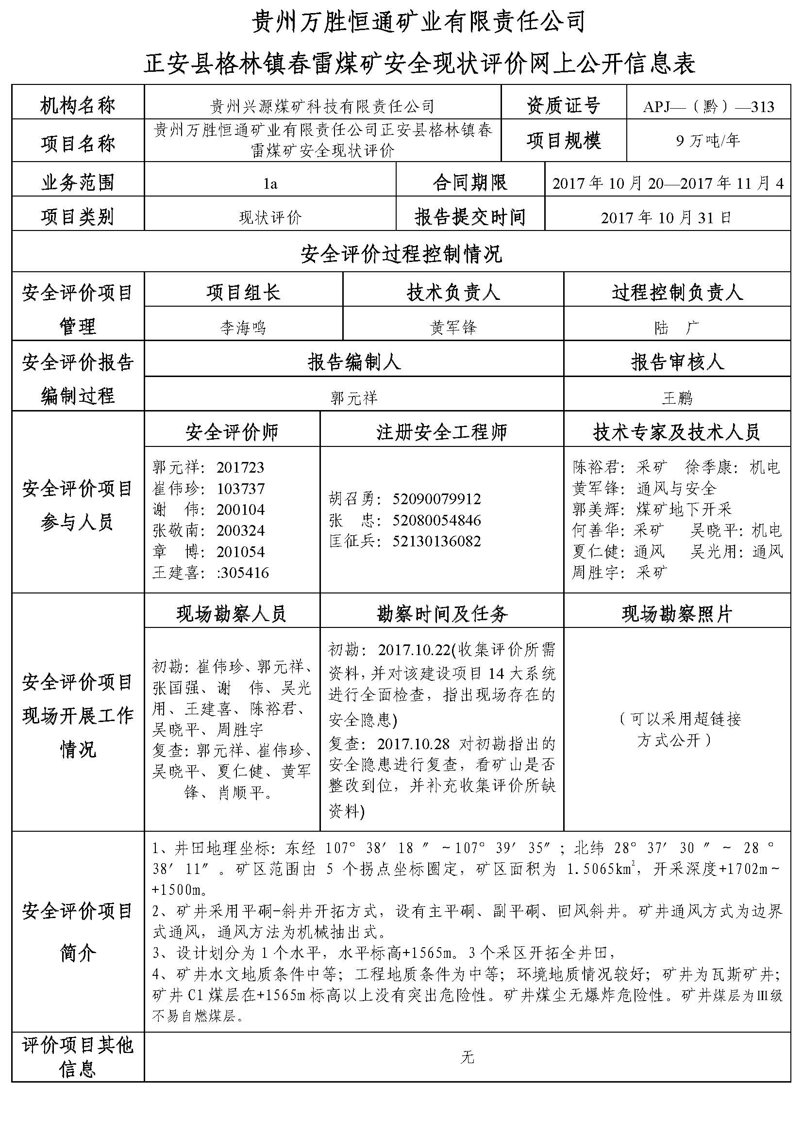貴州萬勝恒通礦業有限責任公司正安縣格林鎮春雷煤礦安全現狀評價網上公開信息表