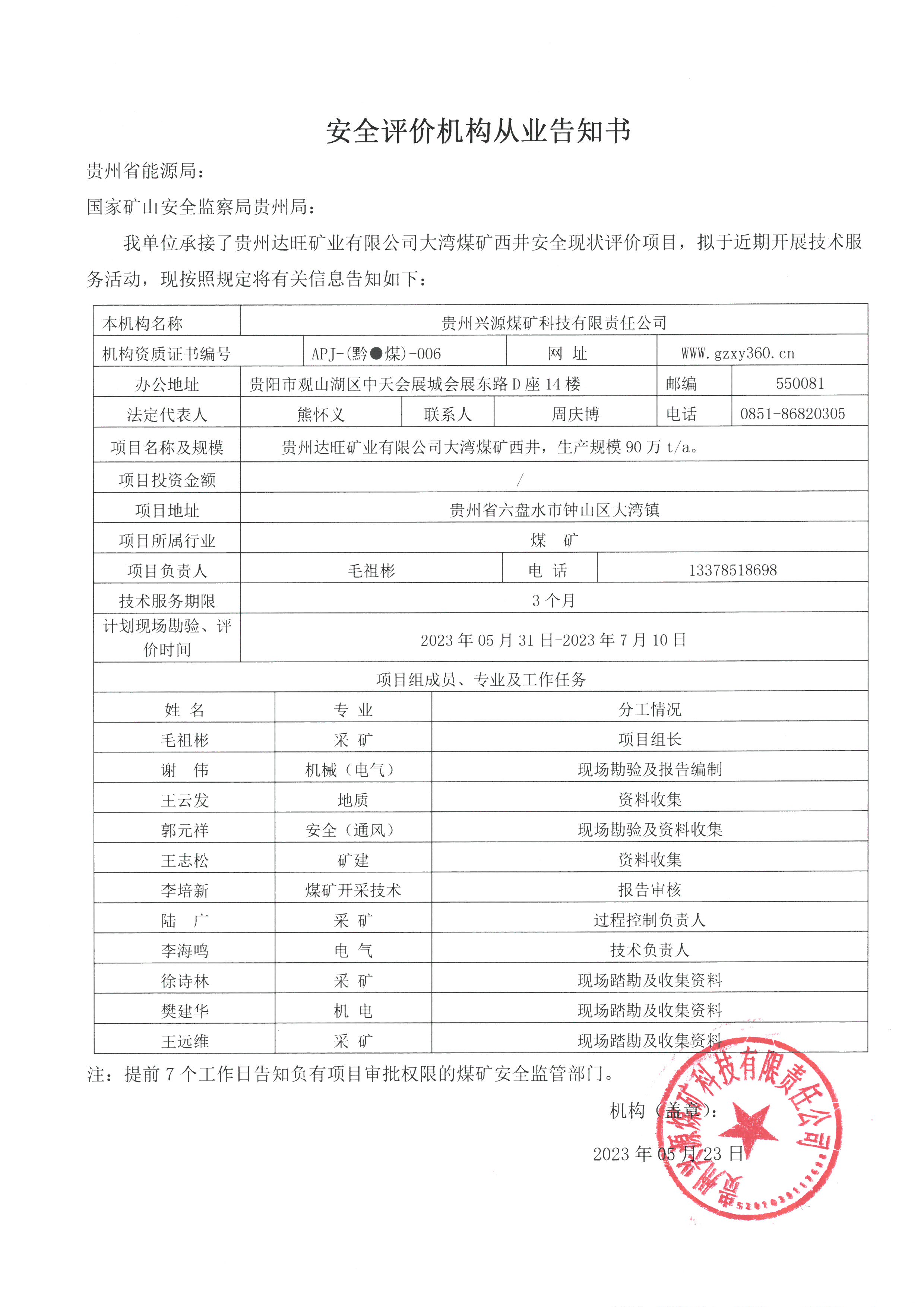 安全評價機構從業告知書【桐梓縣獅溪煤業有限公司桐梓縣獅溪鎮興隆煤礦(45萬噸/年)安全驗收評價】
