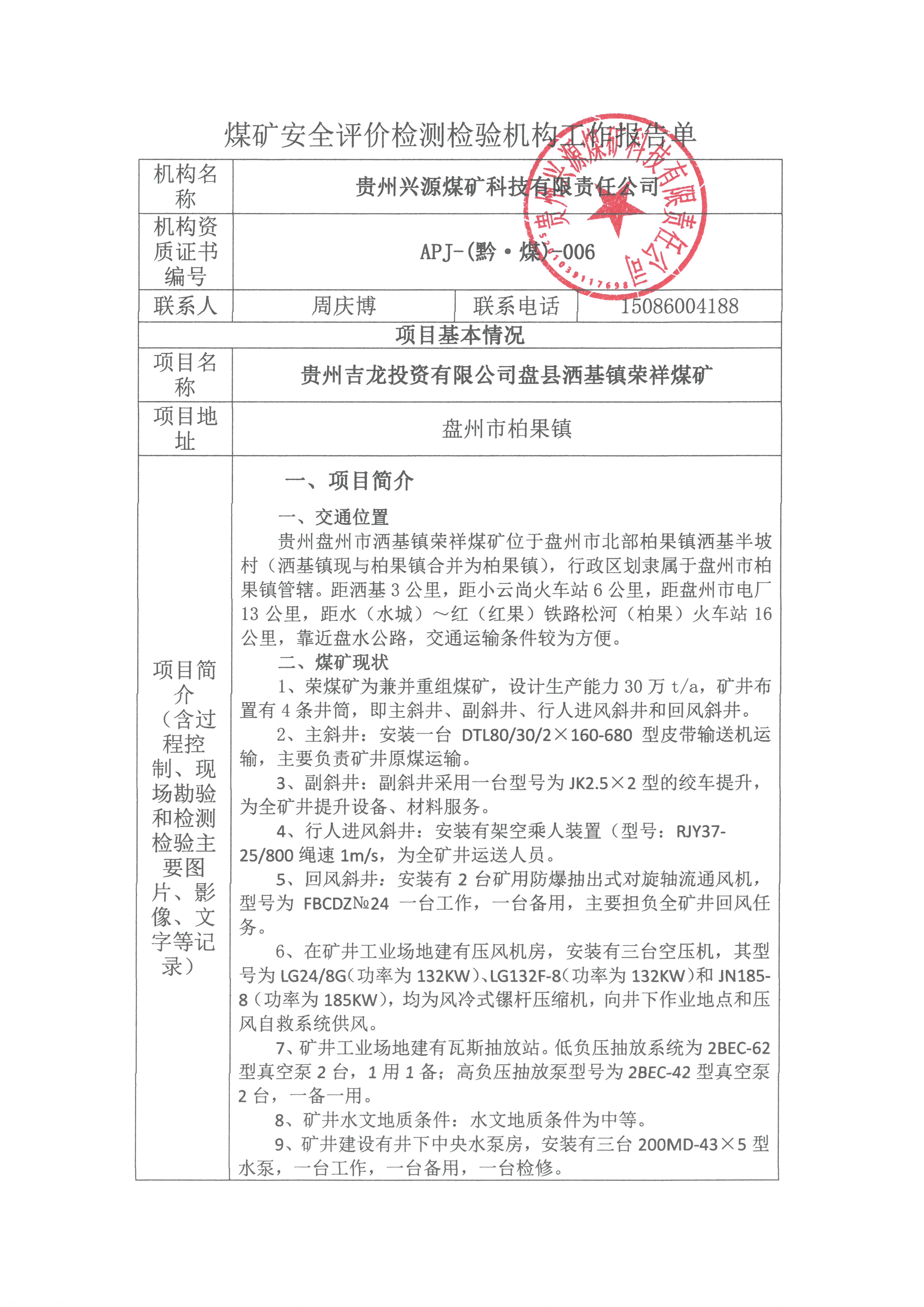 煤礦安全評價檢測檢驗機構工作報告單【貴州吉龍投資有限公司盤縣灑基鎮榮祥煤礦安全現狀評價】