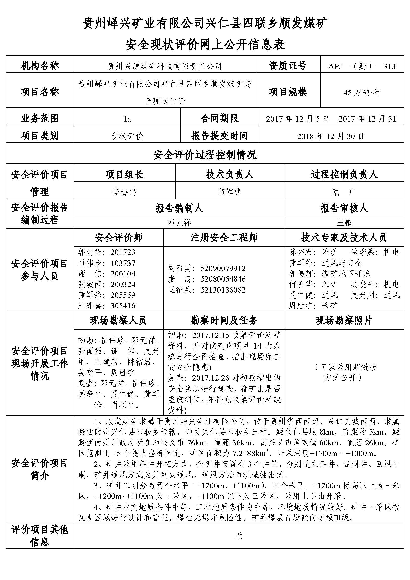 貴州嶧興礦業有限公司興仁縣四聯鄉順發煤礦安全現狀評價網上公開信息表
