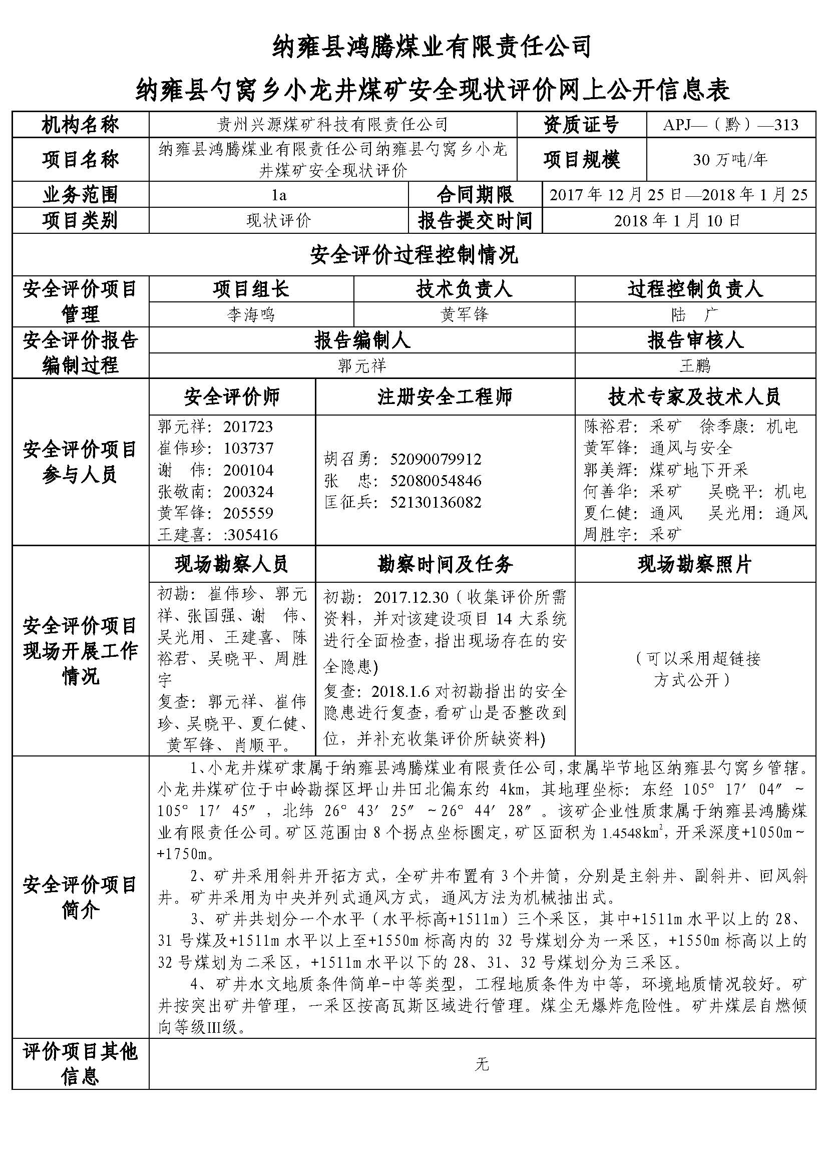 納雍縣鴻騰煤業有限責任公司納雍縣勺窩鄉小龍井煤礦安全現狀評價網上公開信息表