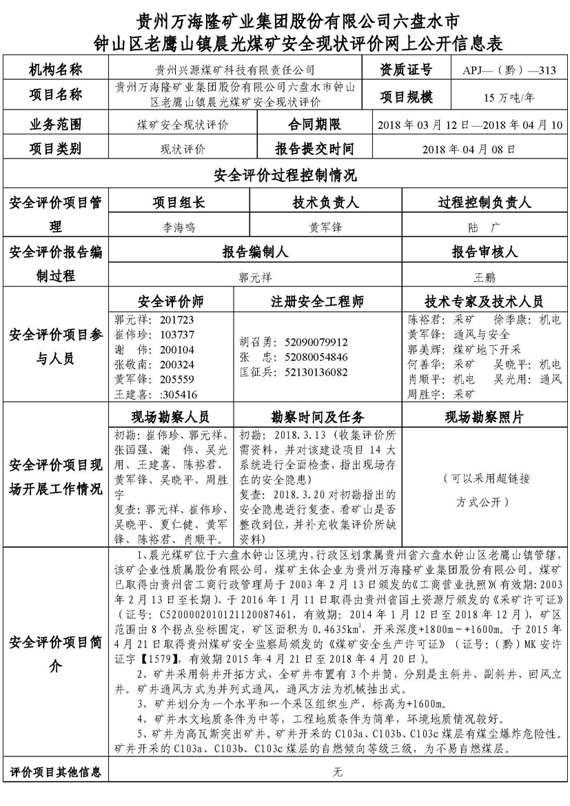 貴州萬海隆礦業(yè)集團股份有限公司六盤水市鐘山區(qū)老鷹山鎮(zhèn)晨光煤礦安全現(xiàn)狀評價網(wǎng)上公開信息表