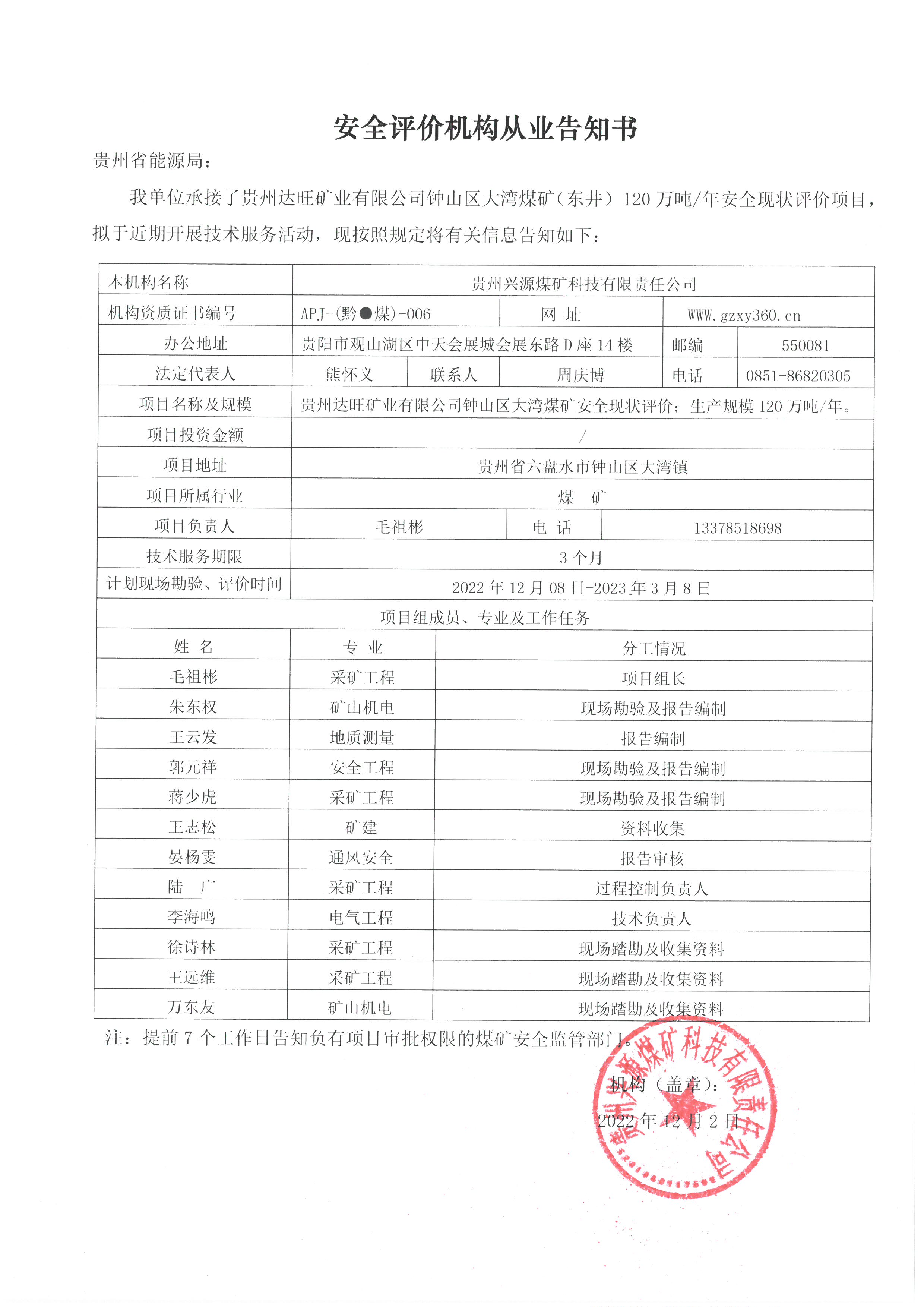 安全評價機構從業(yè)告知書【貴州達旺礦業(yè)有限公司鐘山區(qū)大灣煤礦(東井)】