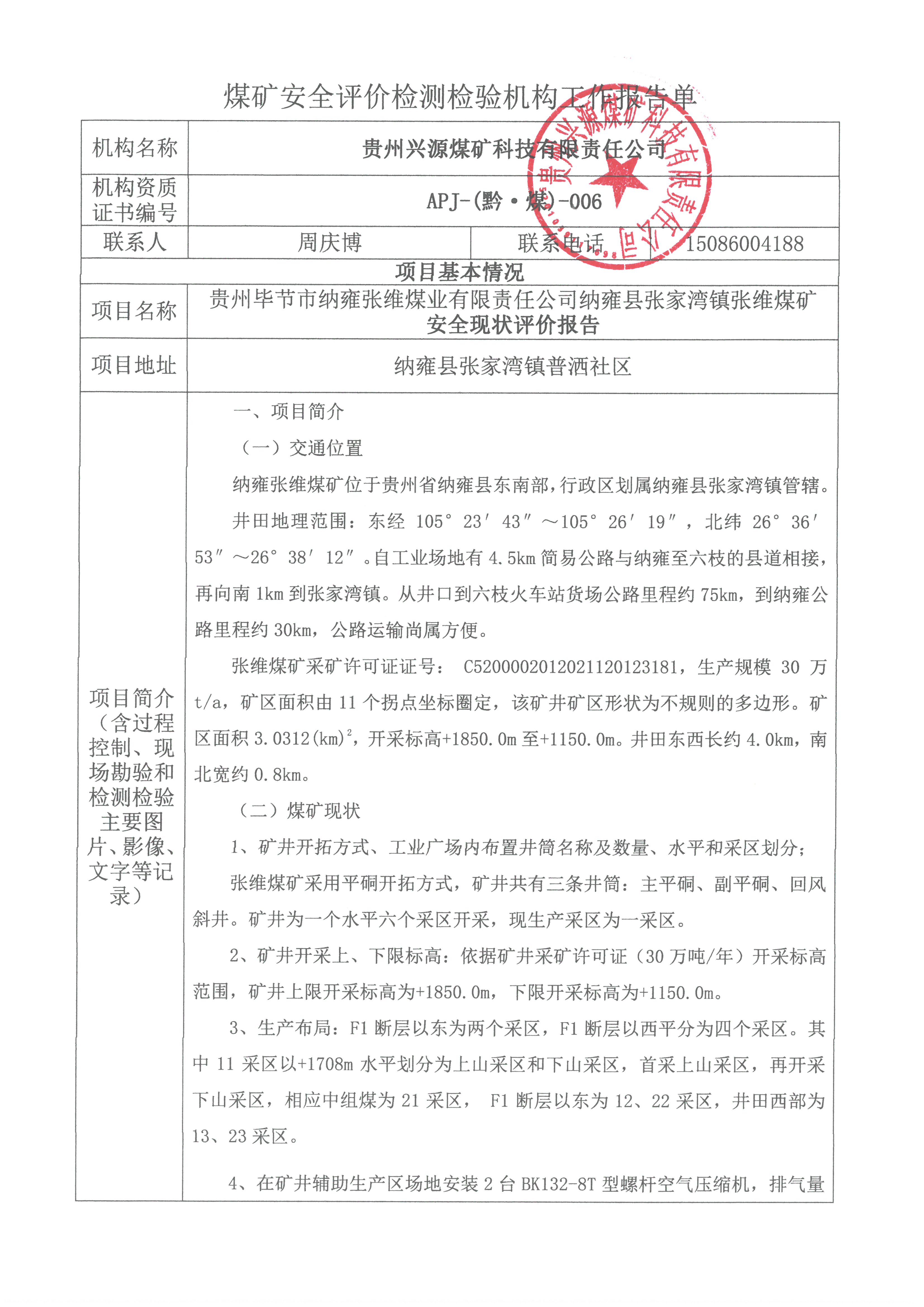 煤礦安全評價檢測檢驗機構工作報告單貴州畢節(jié)市納雍張維煤業(yè)有限責任公司納雍縣張家灣鎮(zhèn)張維煤礦安全現(xiàn)狀評價報告